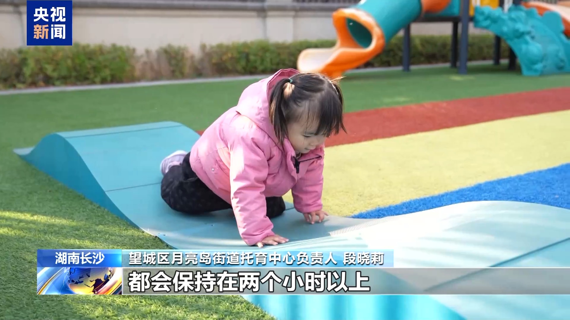 望城区月亮岛街道托育中心负责人 段晓莉:每天我们的运动时间都会保持在两个小时以上,老师也会在每周的课程设计里面来给孩子们进行大运动这方面的锻炼。