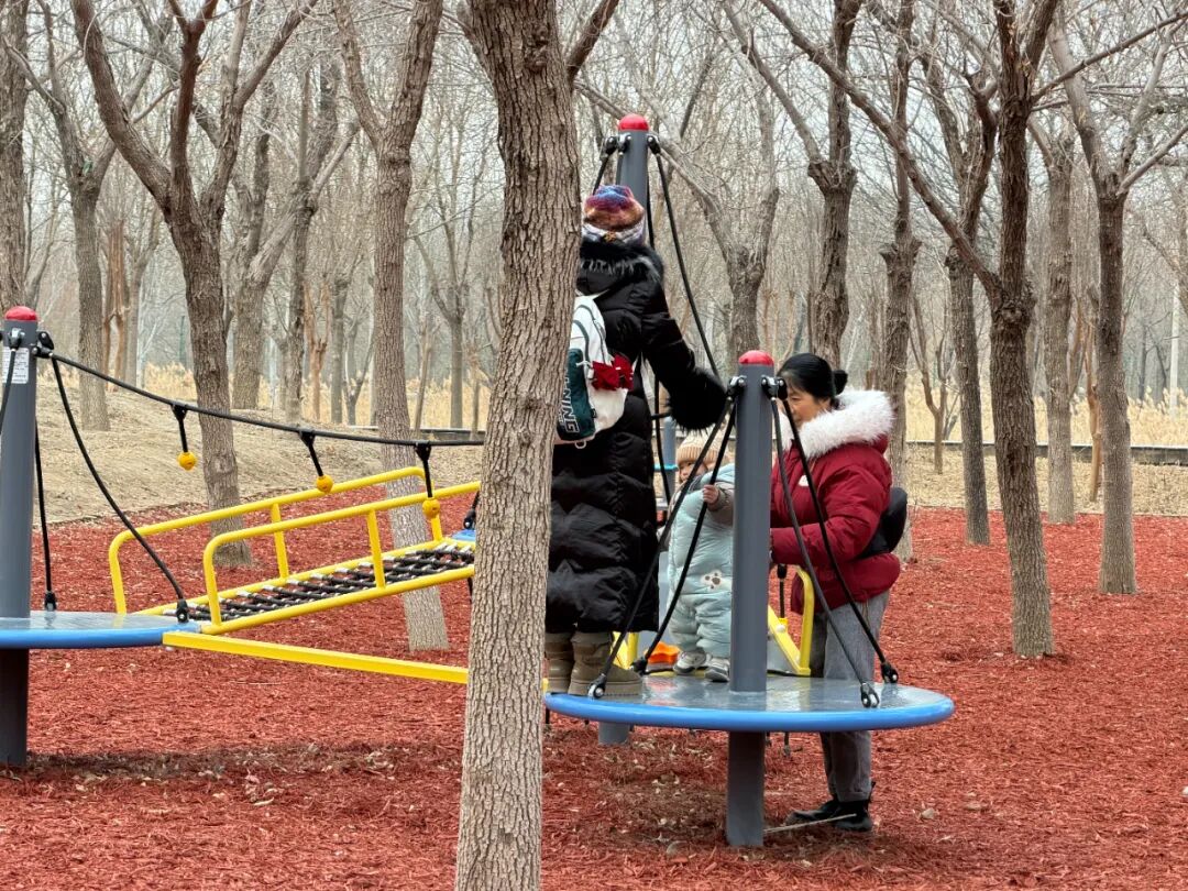 公园历经四个月精心改造,坚守生态底色,将体育场地占比提升至近16%,实现了绿色生态与运动功能的有机融合。漫步园中,蜿蜒的健身步道串联起各个功能区,随处可见的运动场景与疏朗有致的林木相映成趣,令人心旷神怡。自然探趣区巧妙地将运动设施嵌入自然肌理,即使在冬季,林下空间依然开阔,成为家长带孩子进行自然观察、成年人休闲放松的宜人角落。不远处,林下拓展训练基地也成为年轻人挑战自我、释放活力的好去处。