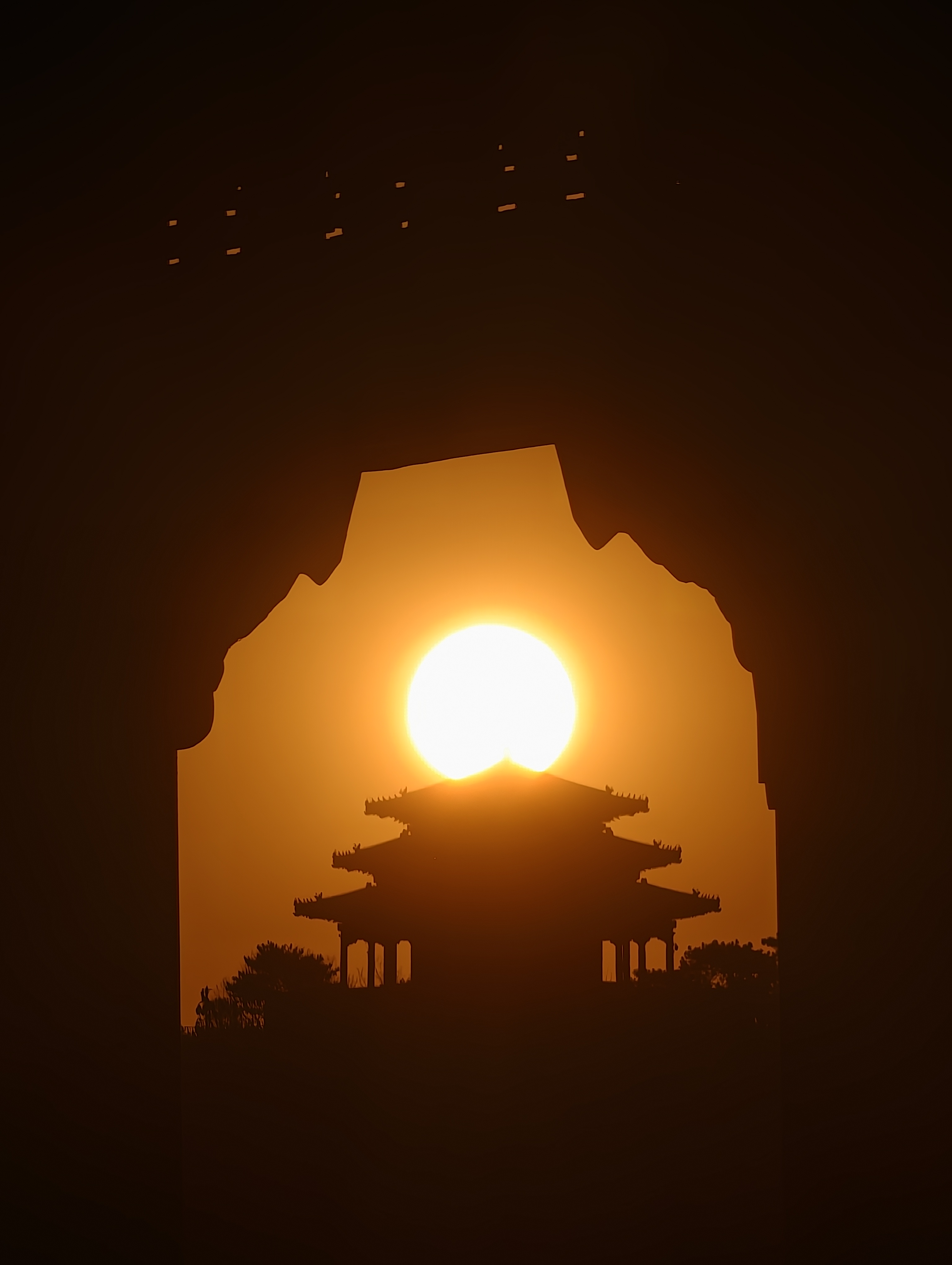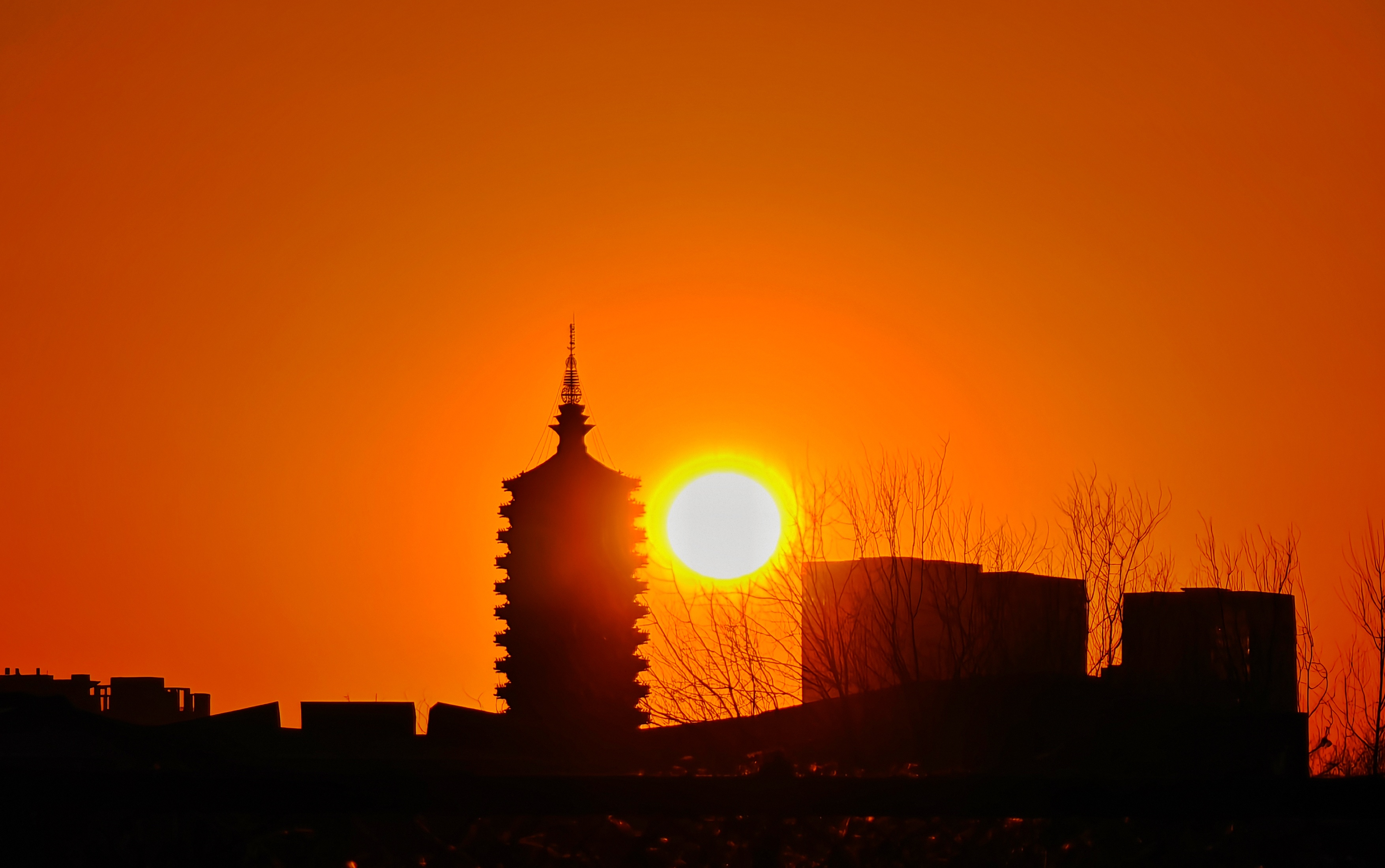 京寒欲至,苇间落日映古建。