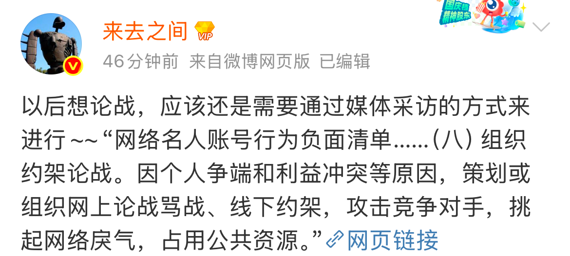 1月16日晚,新浪微博CEO王高飞通过个人微博@来去之间发布最新消息称:以后想论战,应该还是需要通过媒体采访的方式来进行。并引用了“网络名人账号行为负面清单”中第八项:“组织约架论战。因个人争端和利益冲突等原因,策划或组织网上论战骂战、线下约架,攻击竞争对手,挑起网络戾气,占用公共资源。”