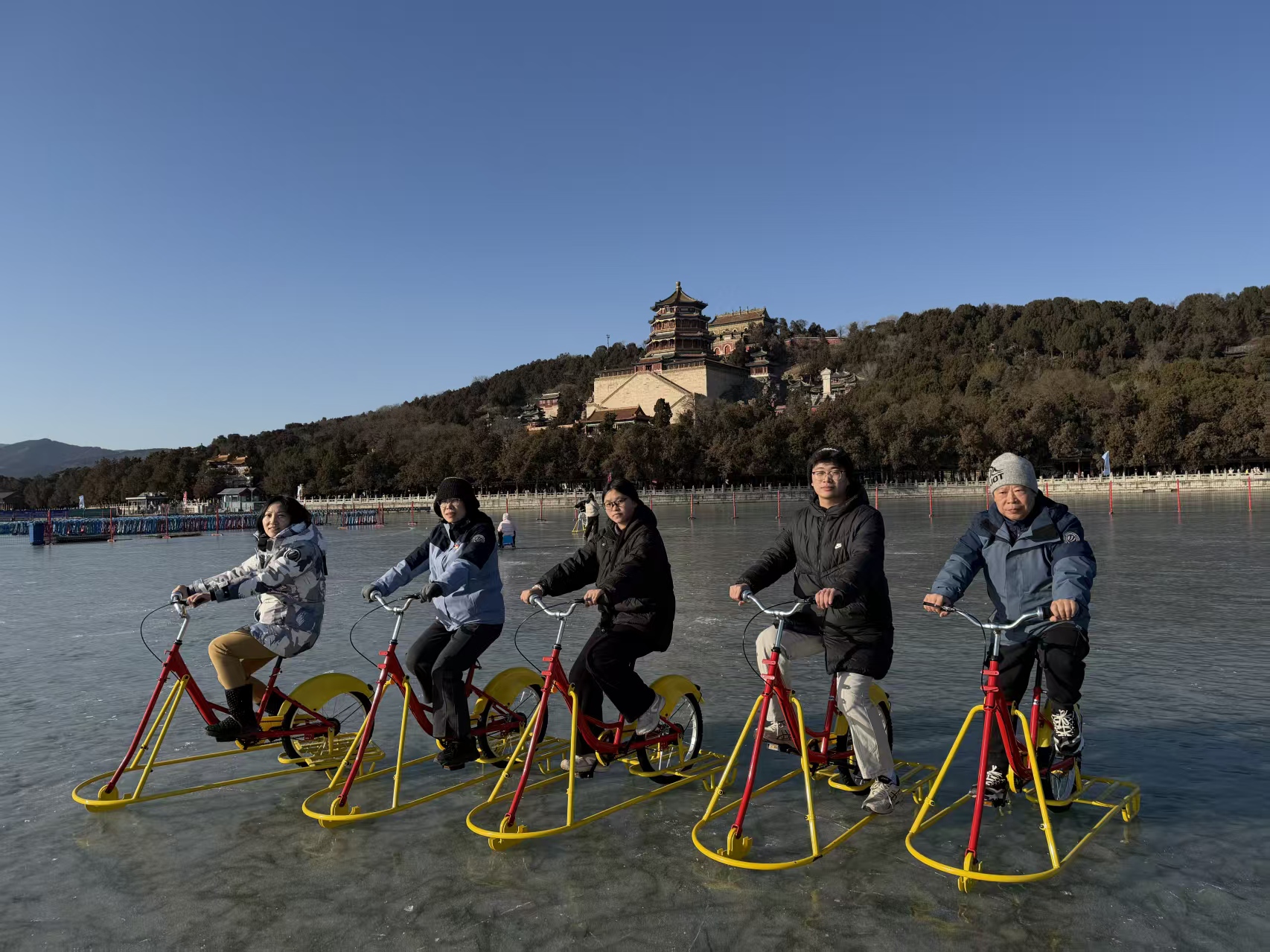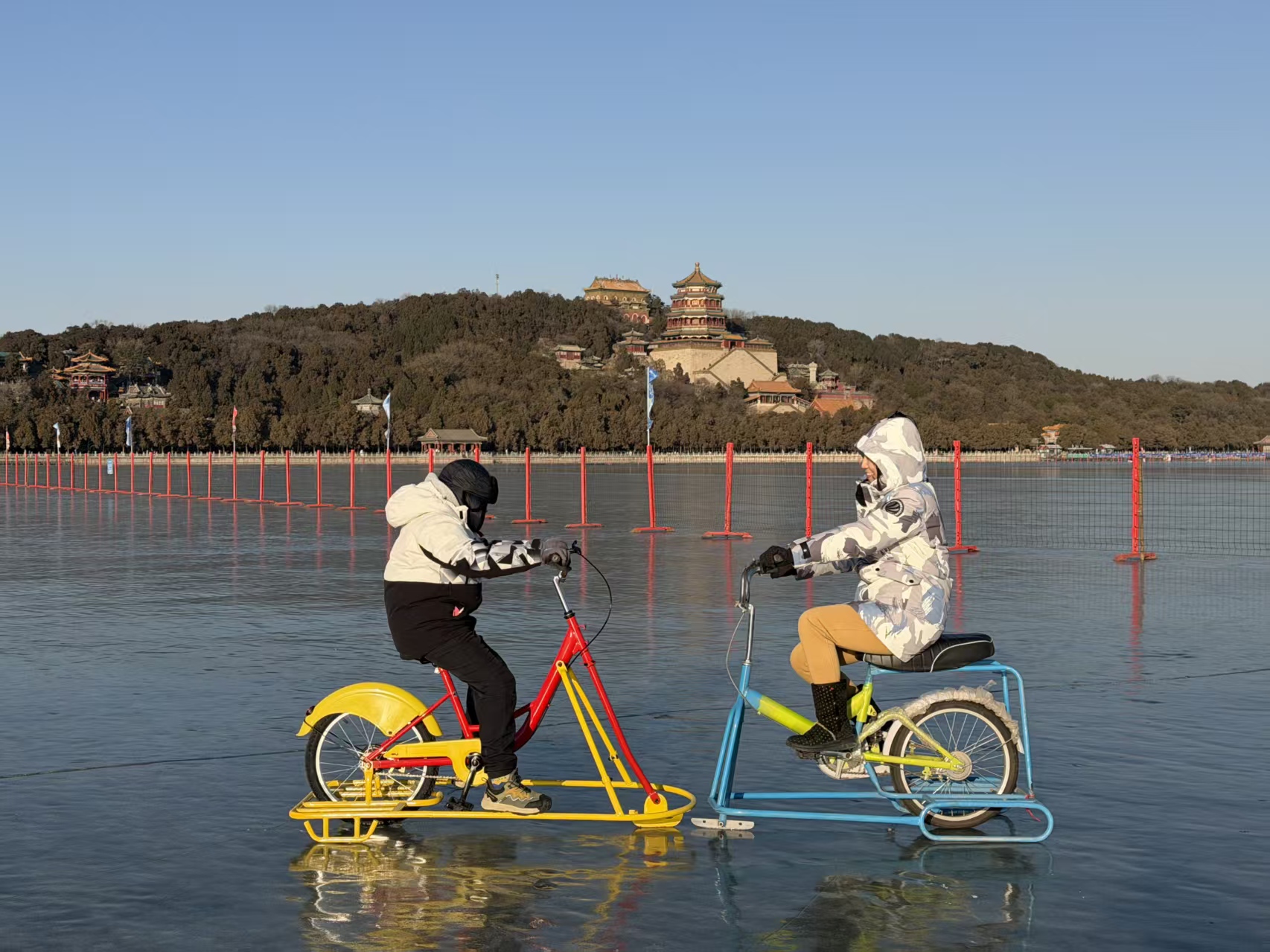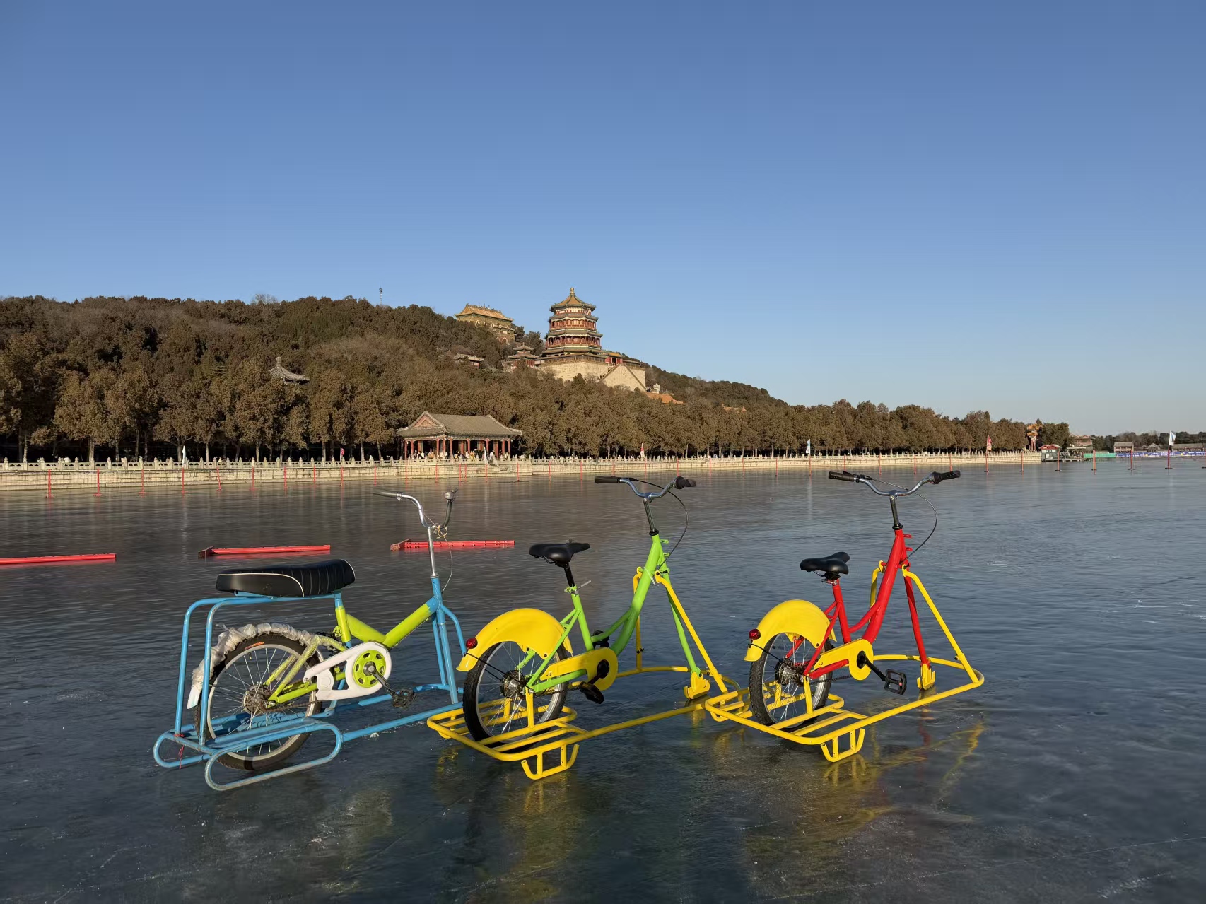 现场配备单人冰车、双人冰车及单人冰上自行车三类传统冰上设施,供游客选择。辽阔的天然冰面与万寿山、佛香阁等古典建筑遥相呼应,形成独具韵味的皇家园林冰雪画卷,让游客在滑行嬉戏间,既能感受传统冰上项目的乐趣,亦能领略冬日户外运动的别样生机。