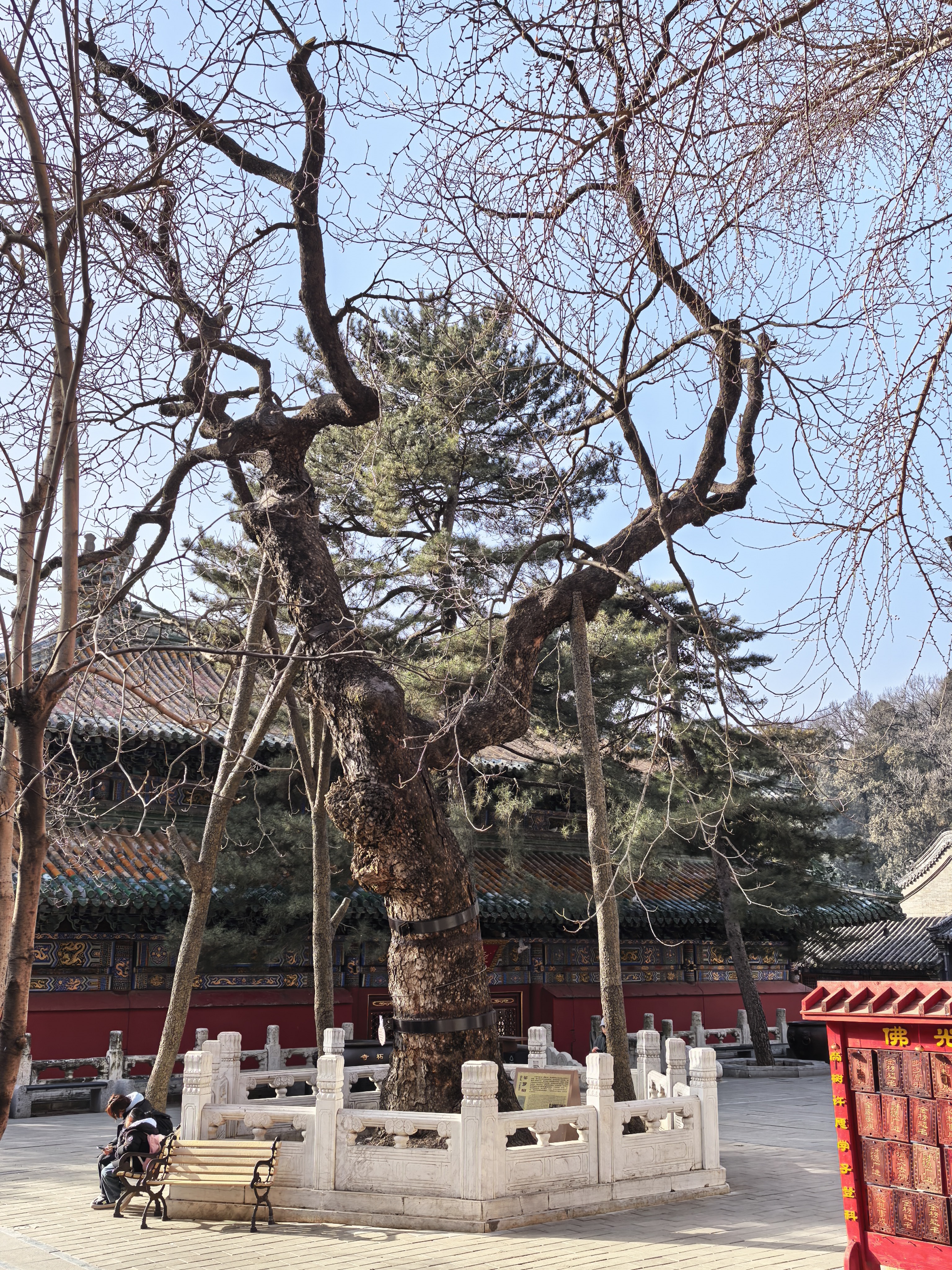 随即,便是观音殿了, 寺内最高的建筑。阳光依稀照进来,将观音菩萨慈悲低垂的眼睫,映得愈发温柔,与这殿外的酷寒恍若两个世界。目光下落,落到莲座前方一侧角落里一块寻常的青砖上,心却微微一震——那灰扑扑的砖面上,竟深深浅浅地,印着两个足痕!并非帝王跪拜留下的庄重印记,那轮廓要纤秀得多,带着一种磨损了边缘的、近乎温柔的凹陷。这便是“公主拜砖”了。传说里,是一位元朝的蒙古公主,因不忍见父汗的征伐,夜奔出宫,至此落发。青丝委地时,不知她可曾回望过那炊金馔玉的宫阙?殿内阴寒,她日日就在这块冷硬的砖上,匍匐,叩首,将青春的胴体温热地、一次次贴上这无情的粗砺。日复一日,年复一年,那温度,那重量,那无言的诉说,竟真的在砖上蚀出了痕迹,像一滴泪,慢慢渗进了石头的心。公主当年的凝望,是否也如那鸽子一般,专注,忘我,将全部的生命与热望,都寄托于慈悲?只是鸽子尚能振翅飞去,而这位殿中的女子,却将自己的一生,钉死在这方寸的砖石上了。
