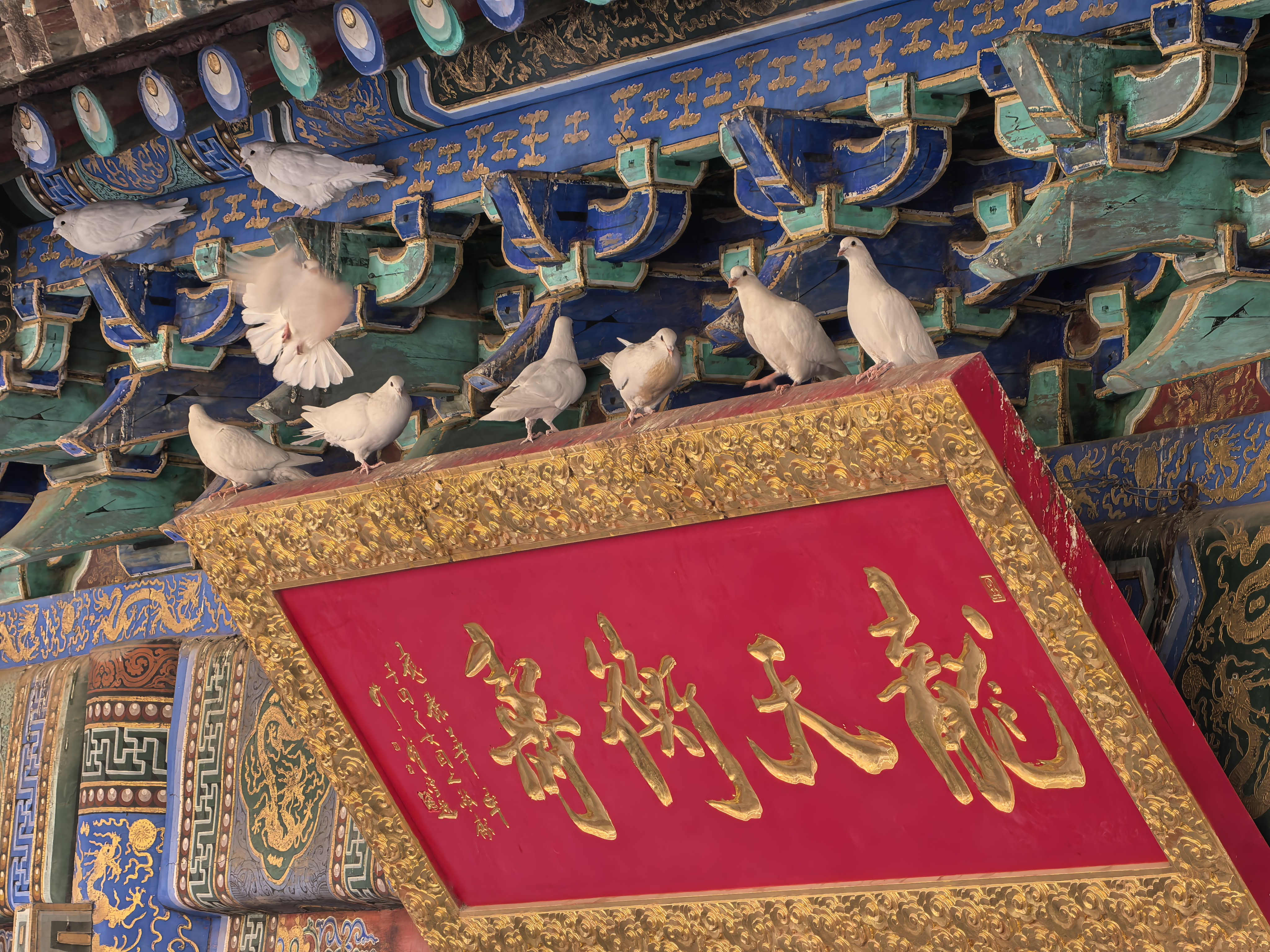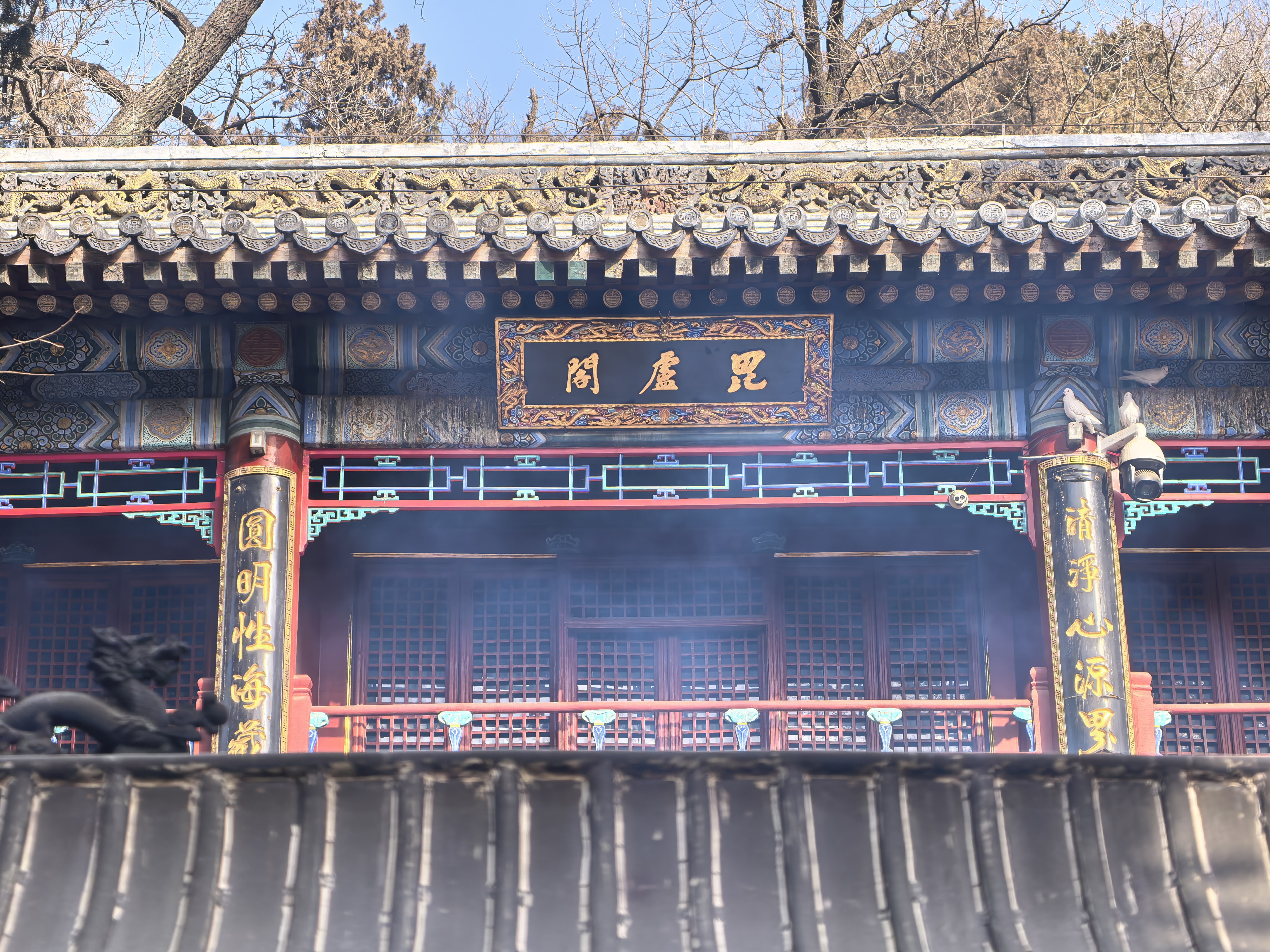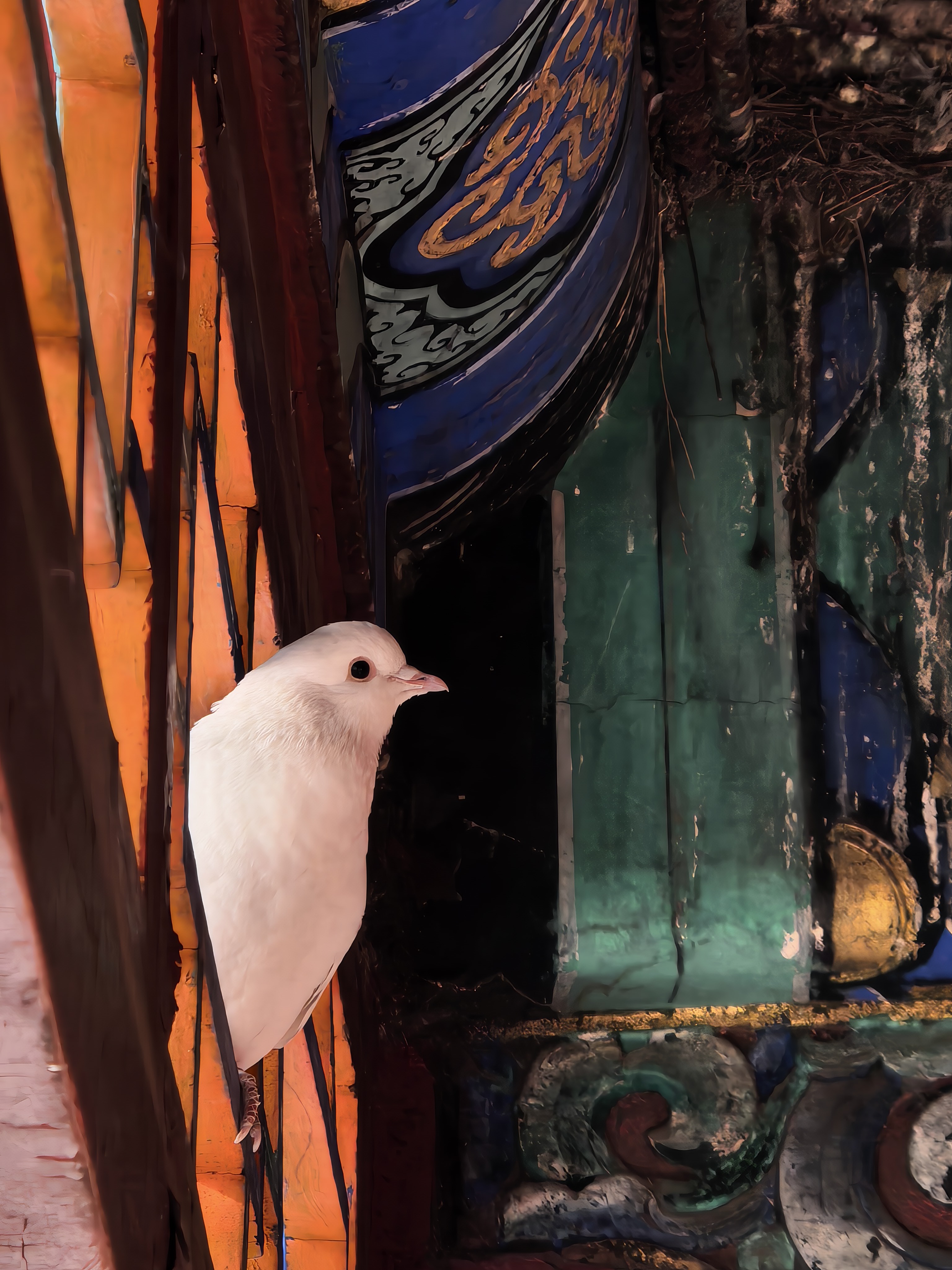 脚步被引着向东,到了毗卢阁。阁前的木窗棂,格子极疏朗,裱着那后面深殿的幽暗,像一幅天然的木框画。我的目光正欲滑过,却猛地定住了——那最上方的一根横楞上,竟站着一只鸽子!白羽,毫不起眼,面向殿阁深处那隐约的佛像,直挺挺地立着,小小的头颅微微前倾,竟似人礼拜一般,凝然不动。寒风拂过它颈边的细羽,微微颤动,它却恍若未觉。是痴了么?还是这佛国的清寂,连一只禽鸟也摄住了心神?抑或,它只是在依着自己的方式,进行一场无声的、冬日里的修行?我看得呆了,心中那潭被寒意凝住的静水,仿佛被这小小的生灵,投入了一颗极细的、却又漾开无限涟漪的石子。它在那儿站了多久?还要站多久?没有人知道。它只是那样站着,与殿里的佛,殿外的枯树,成了这寒日古刹里,一个浑然天成的、不可思议的注解。