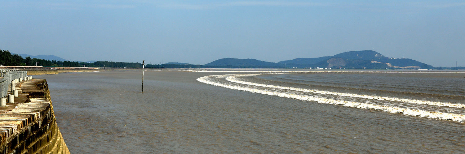“波纹潮”是静悄悄来到钱塘江的。欣赏它,犹如聆听潮水在江面上舒缓的呼吸。