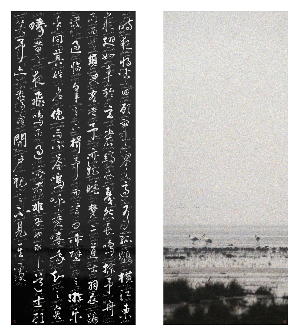 展览的一大亮点,是首次公开展出的2025年新作《苏-Thoreau》。秋麦在中国学习书法20余年,作品中节录了苏轼《后赤壁赋》和《瓦尔登湖》的作者,美国作家、哲学家亨利•戴维•梭罗的散文集《康科德与梅里马克河上一周》中描绘“河上观鸟”的段落,他亲自用中国书法形式书写,通过对中英文字结构的精心排列重组,使两种语言在视觉、音律与内容上相互嵌合。与之并置的摄影部分,则定格在了鄱阳湖鸟群静立的瞬间,因而书法在此不再局限于对文本内容的再现,而成为一种介于书写与绘画之间的视觉语言。