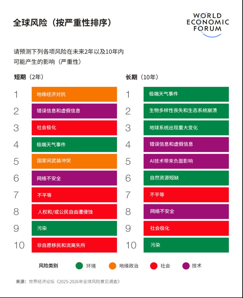报告从当前(2026年)、中短期(未来两年)和长期(未来十年)三个时间维度分析了全球风险。武装冲突、经济工具武器化与社会分化正在近期形成叠加冲击,随着这些风险在当前不断升级,技术加速发展、环境持续恶化等长期挑战也正在产生连锁效应。
