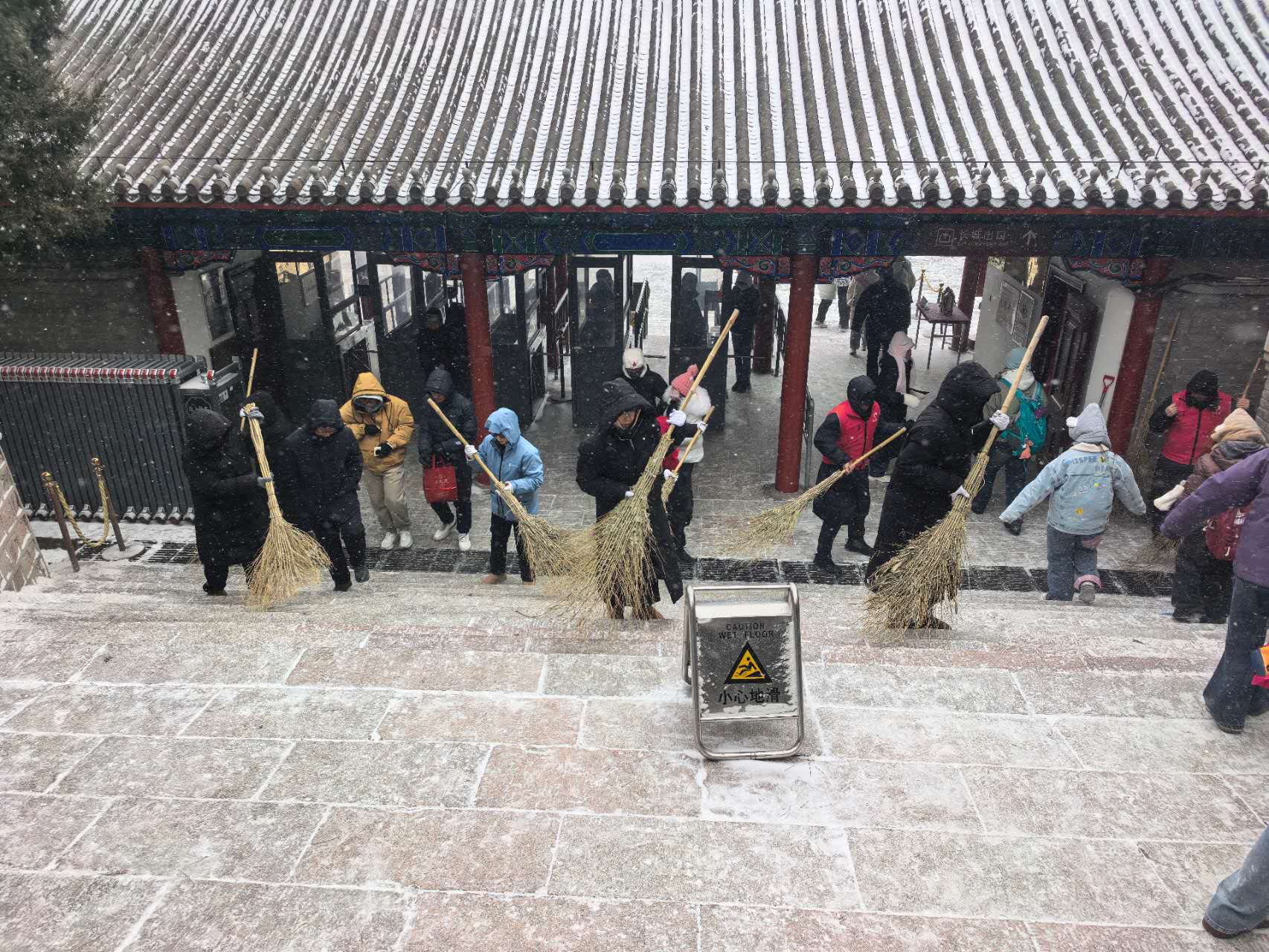风雪中,随处可见工作人员忙碌的身影。他们手持扫帚,一步步清理登城步道;在关城检票口、游客服务中心等地,免费热水供应点悄然开放,为游客递上一份温暖的关怀。