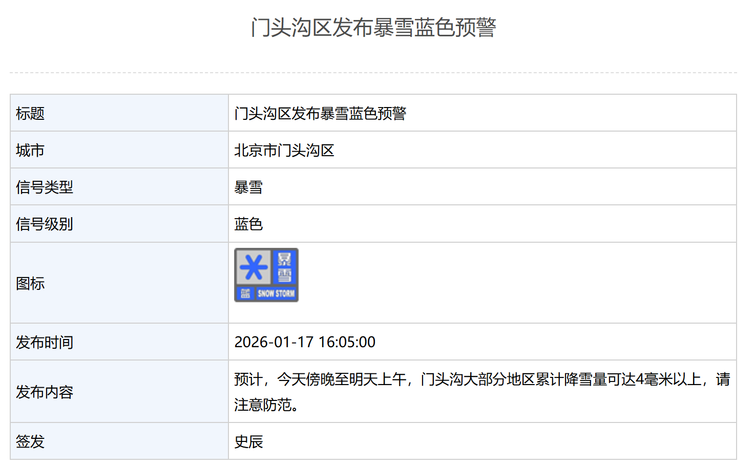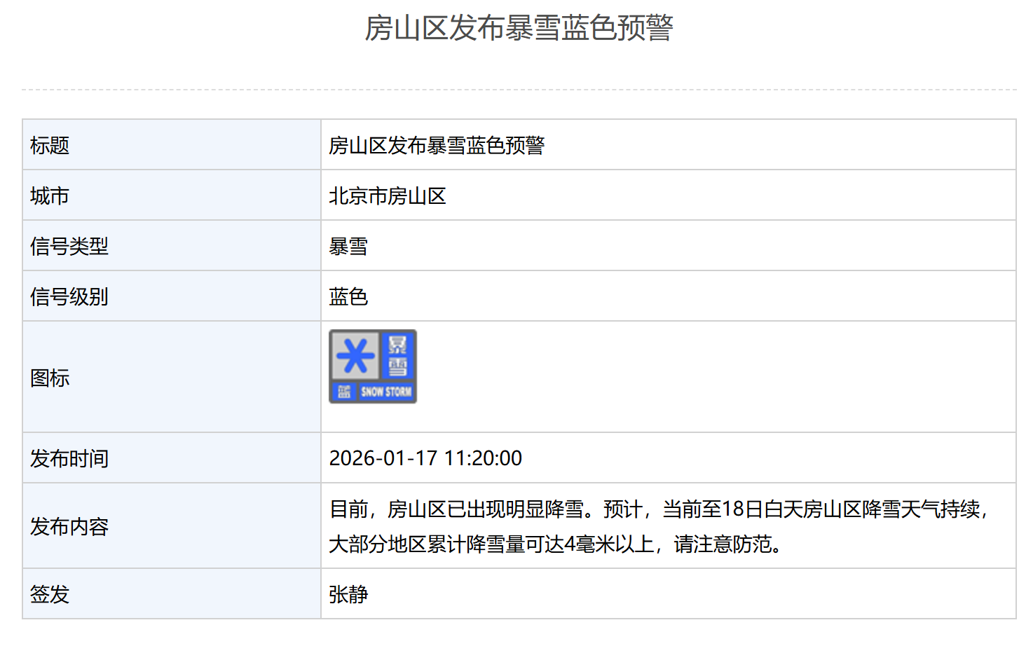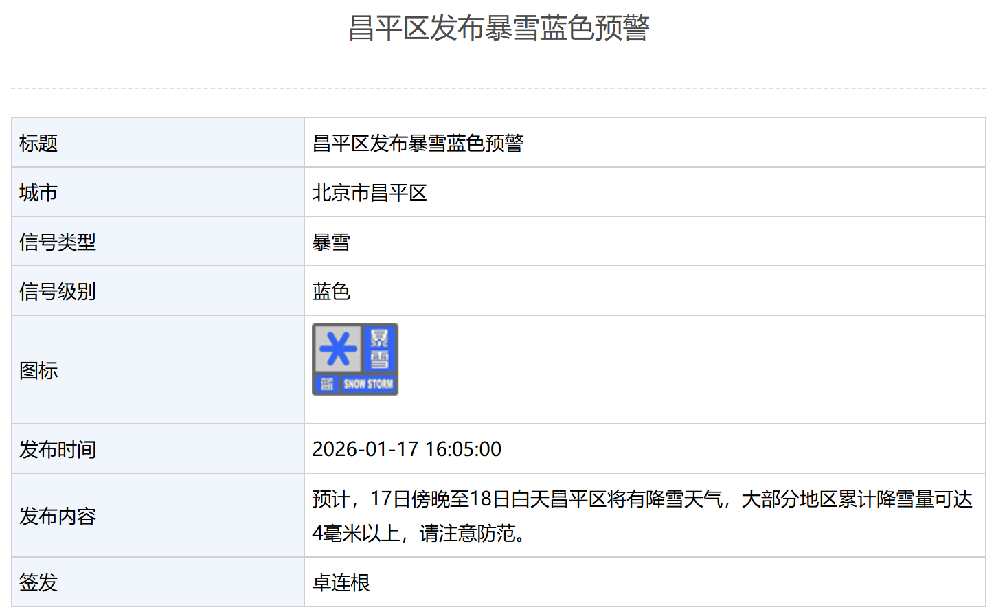 昌平区发布暴雪蓝色预警:预计,17日傍晚至18日白天昌平区将有降雪天气,大部分地区累计降雪量可达4毫米以上,请注意防范。