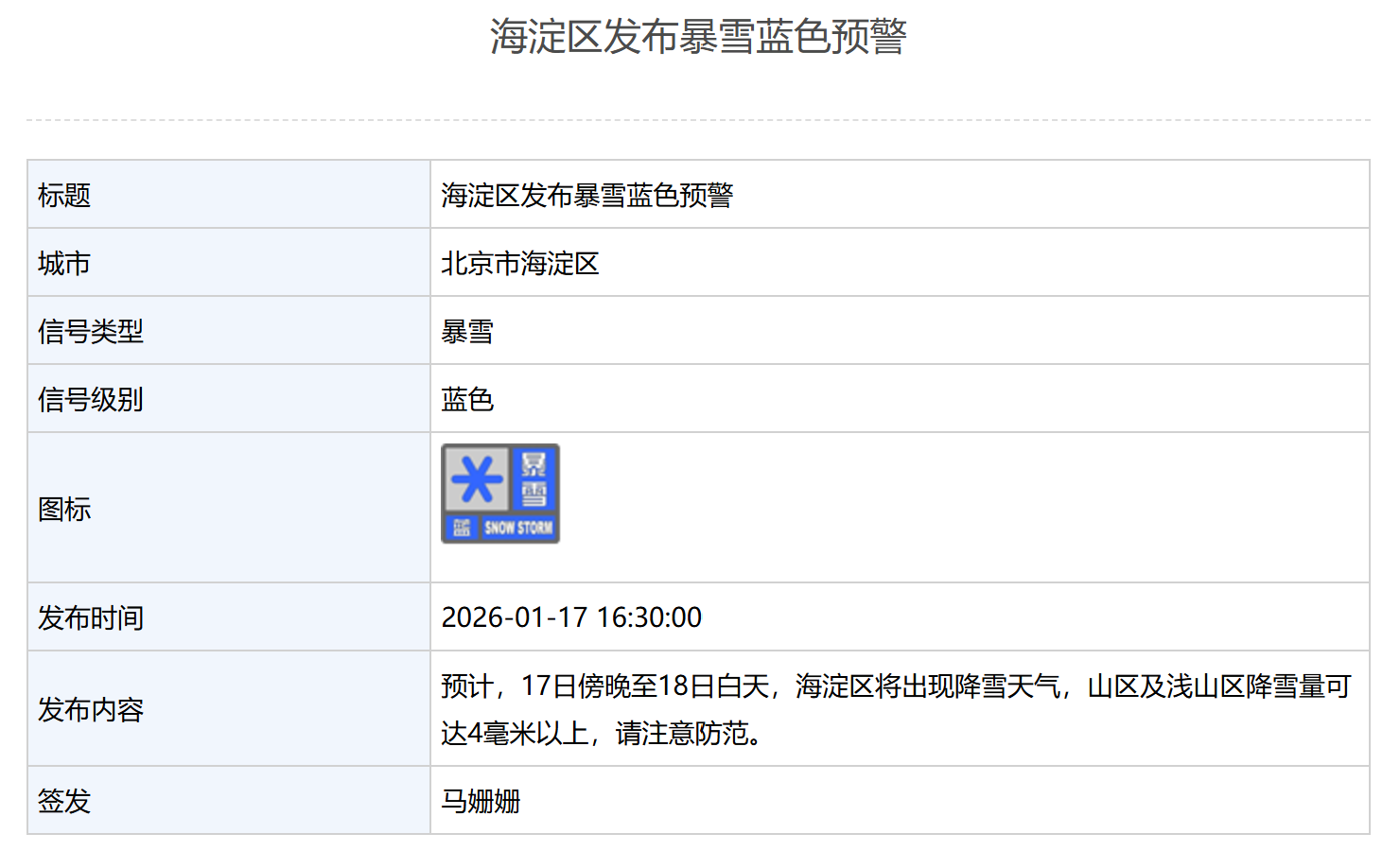 海淀区发布暴雪蓝色预警:预计,17日傍晚至18日白天,海淀区将出现降雪天气,山区及浅山区降雪量可达4毫米以上,请注意防范。