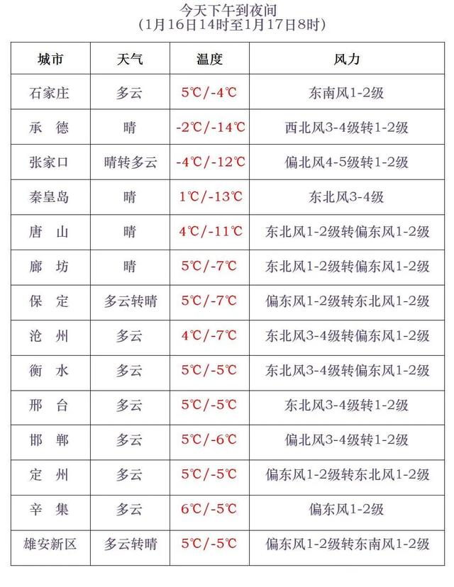 明天早晨,张家口、承德、秦皇岛北部、邢台南部、邯郸最低气温继续下降3~5℃,局地下降6~8℃。19日早晨,张家口、承德最低气温下降4~6℃,局地8~10℃。