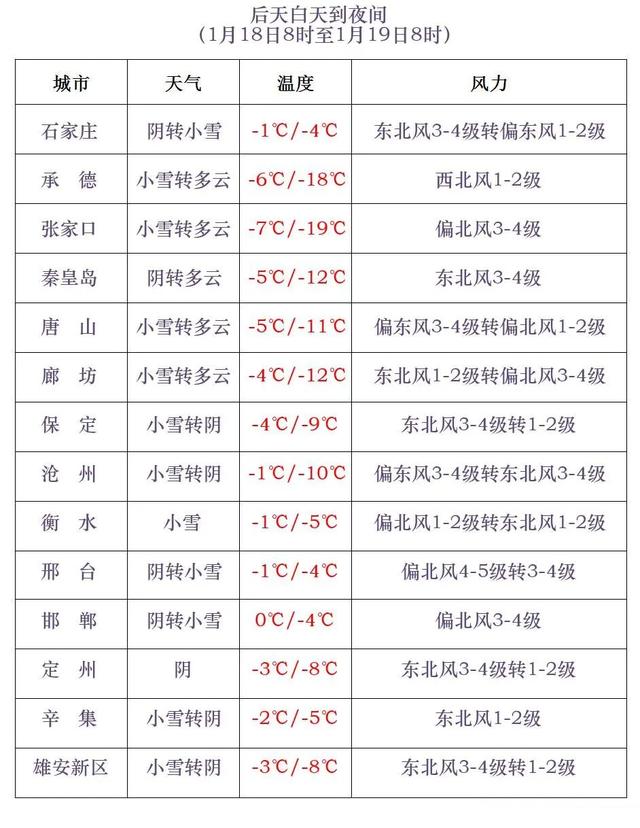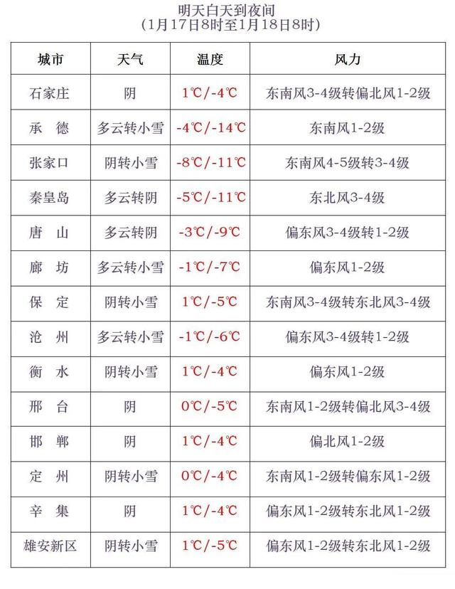 明天夜间到18日,全省多云转阴,大部分地区有小雪或零星小雪,其中沧州东部有中雪。
