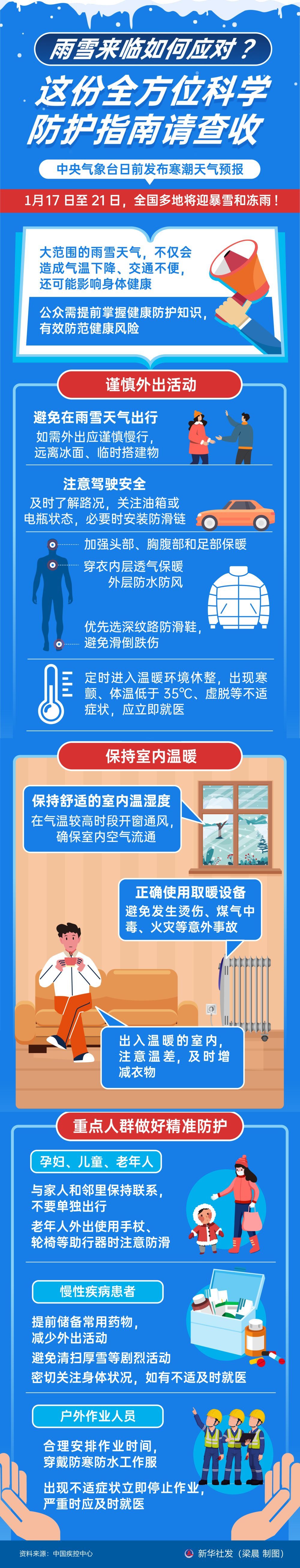 中央气象台日前发布寒潮天气预报,1月17日至21日,全国多地将迎暴雪和冻雨!大范围的雨雪天气,不仅会造成气温下降、交通不便,还可能影响身体健康。公众需提前掌握健康防护知识,有效防范健康风险。