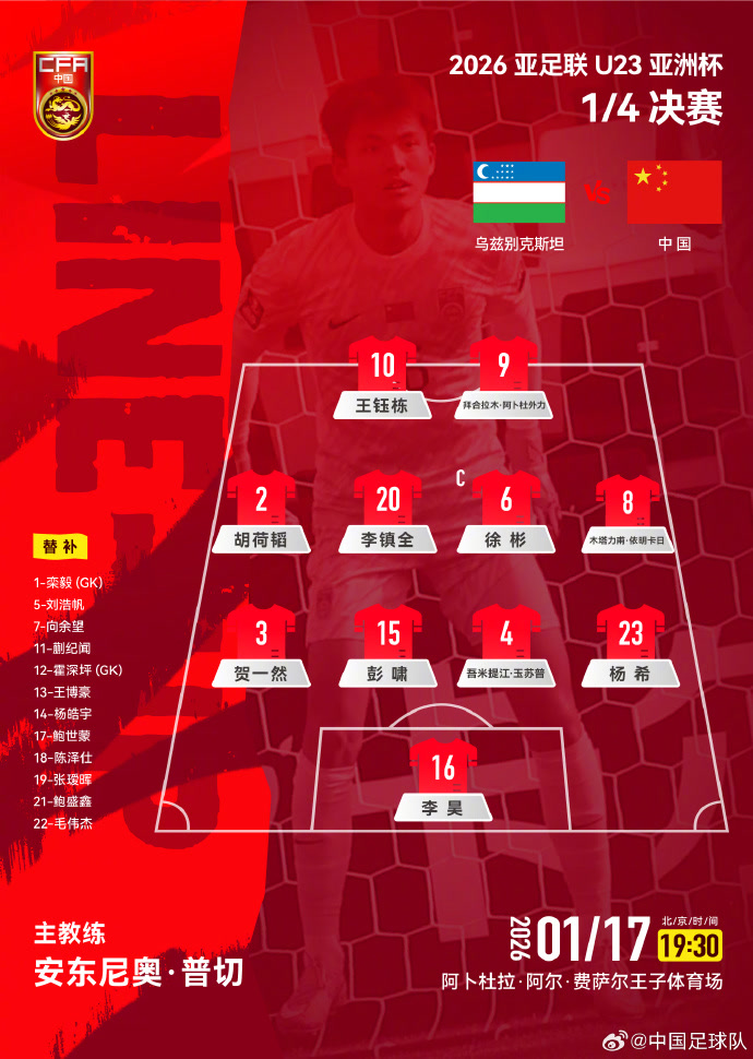 1月17日晚,U23亚洲杯1/4决赛,在120分钟内和乌兹别克斯坦队打成0比0后,U23国足在点球大战中以4比2获胜,首次打进U23亚洲杯4强。他们将在半决赛中对阵越南队,争夺决赛资格,比赛时间为北京时间1月20日23时30分。