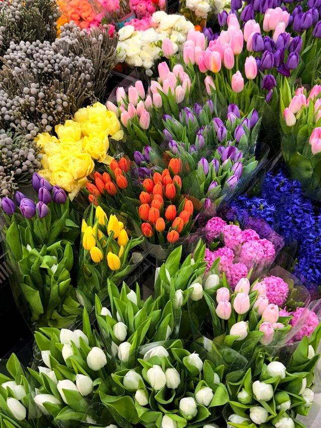 鲜花售卖区一片姹紫嫣红、花团锦簇,人群熙熙攘攘。不仅有百合、玫瑰、郁金香、澳洲蜡梅、洋牡丹、银柳等常规品种,还有北美冬青、雪柳和吸色文心兰等热门花卉。