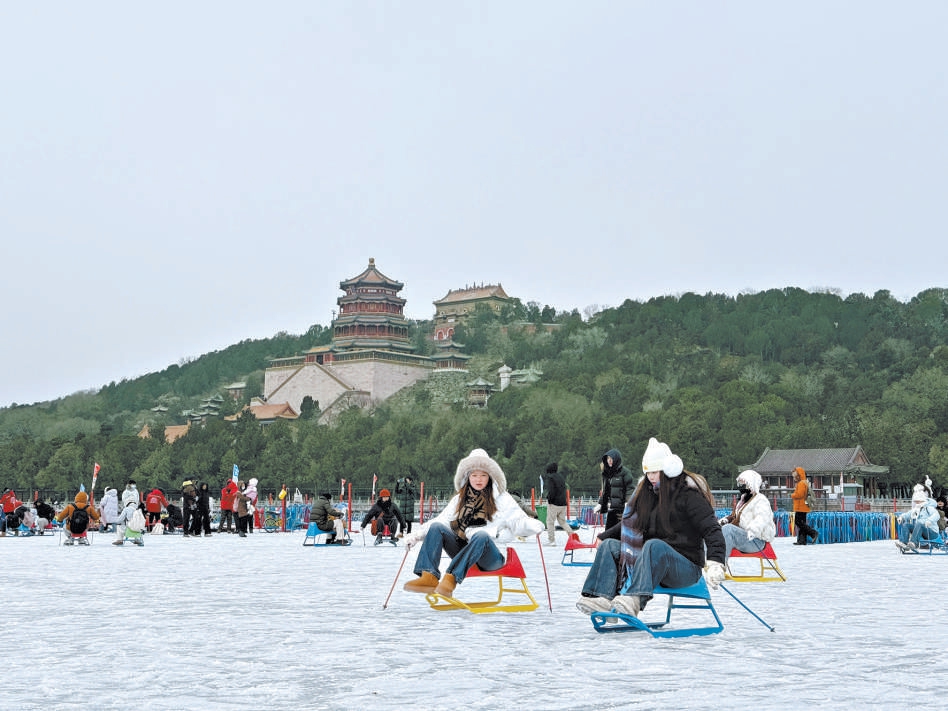 昨天,颐和园昆明湖冰场向市民开放,色彩明快的冰车与冰上自行车在冰面上往来穿梭,为静谧的古典园林增添了生机盎然的冬日活力。本报记者 吴镝摄