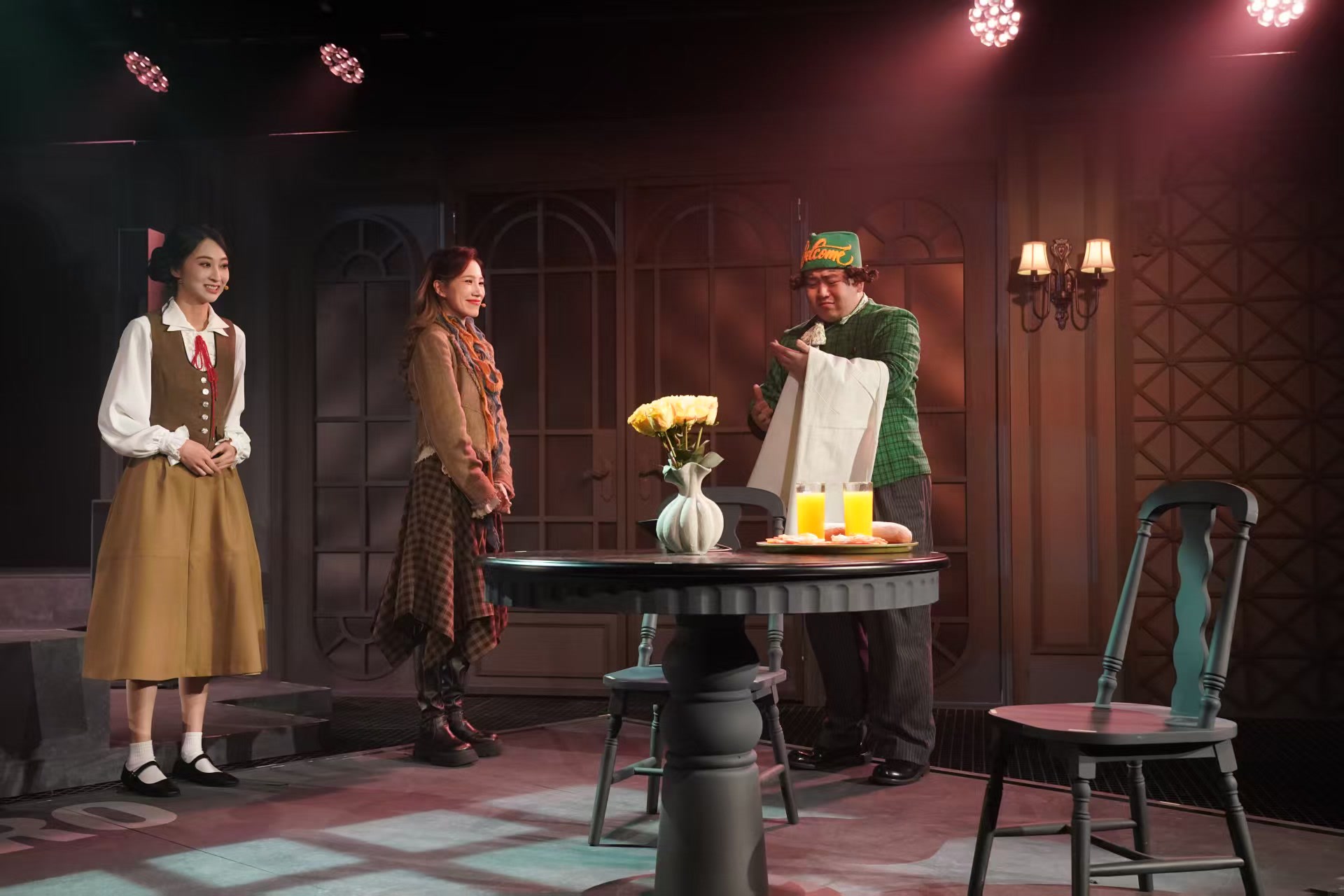 相较于早已问世的大剧场版,此番小剧场沉浸版的匠心,首要在于空间的“魔法”。该剧设计了复古的酒店布景,客房里书桌上摆放着老式电话与鲜花,昏黄的壁灯透露着悬疑氛围,一进入剧场,观众就仿佛置身于案发现场。舞台的边界被彻底消融,三面观众环绕着剧中“谋杀案”的现场,演员会出现在观众席通道上,与观众的最近距离不过一米。随着剧情的推进,观众可能突然成为剧情的一部分,被临时“征召”去搬运行李,或是在演员即兴抛出的台词梗中,以自然反应碰撞出意外的喜剧火花。