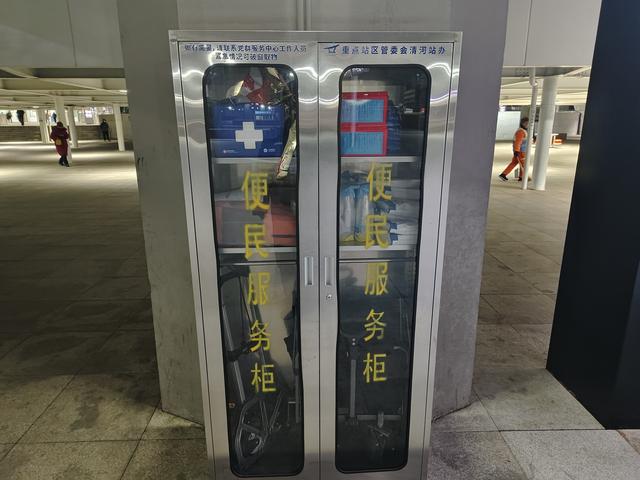 不止于此,在出站口、出租车调度站、网约车接驳区等关键出行节点,5处便民服务柜在此“安家”,将贴心服务送到旅客身边。这些服务柜虽体积不大,却“藏着”满满的关怀:柜内应急医药箱备齐碘伏、创可贴、消毒湿巾等常用药品,可快速应对旅客突发身体不适;折叠拉车等便民物资也随时待命,全方位保障旅客出行,让暖心服务在清河站办范围全程在线、无缝衔接。