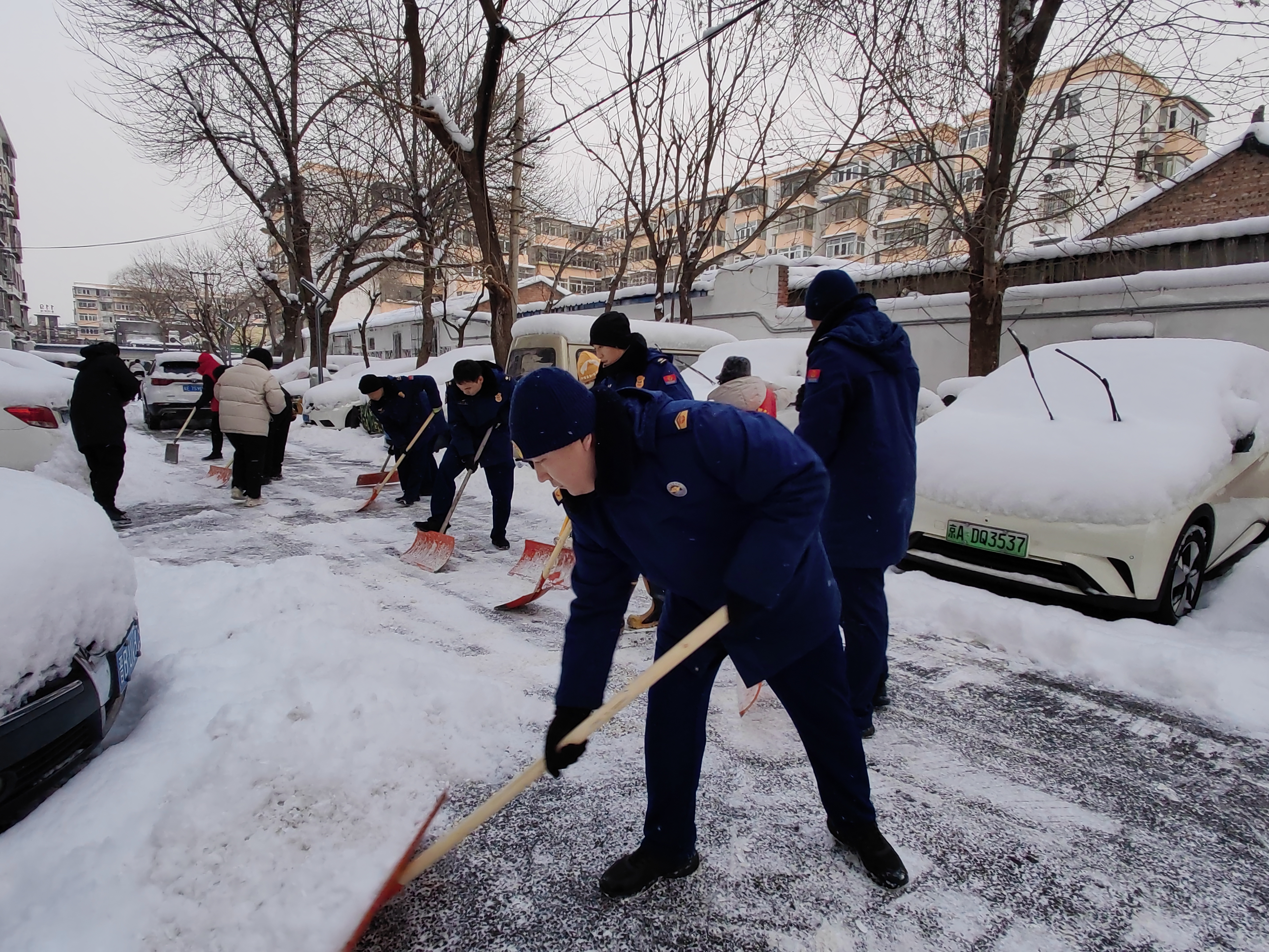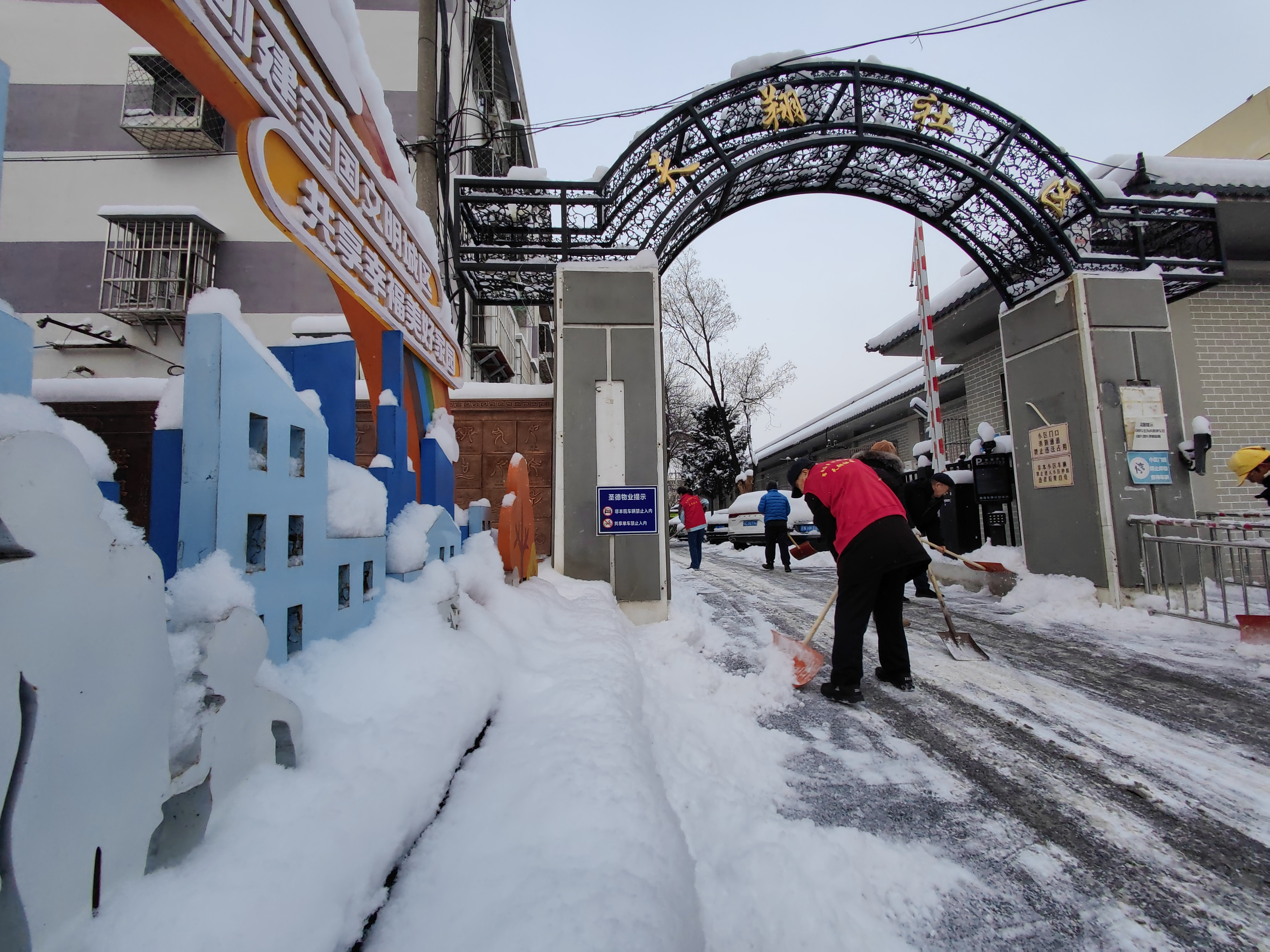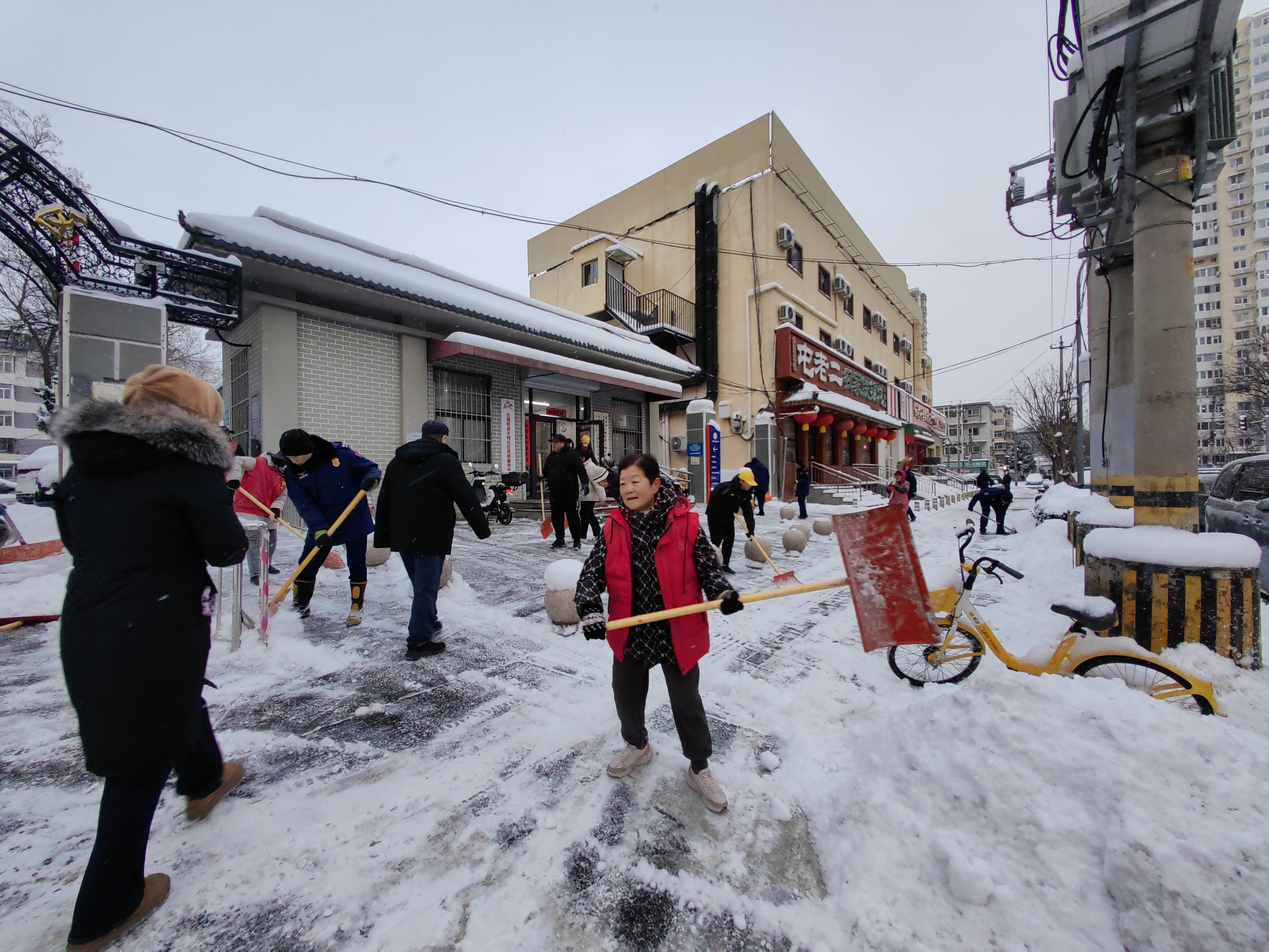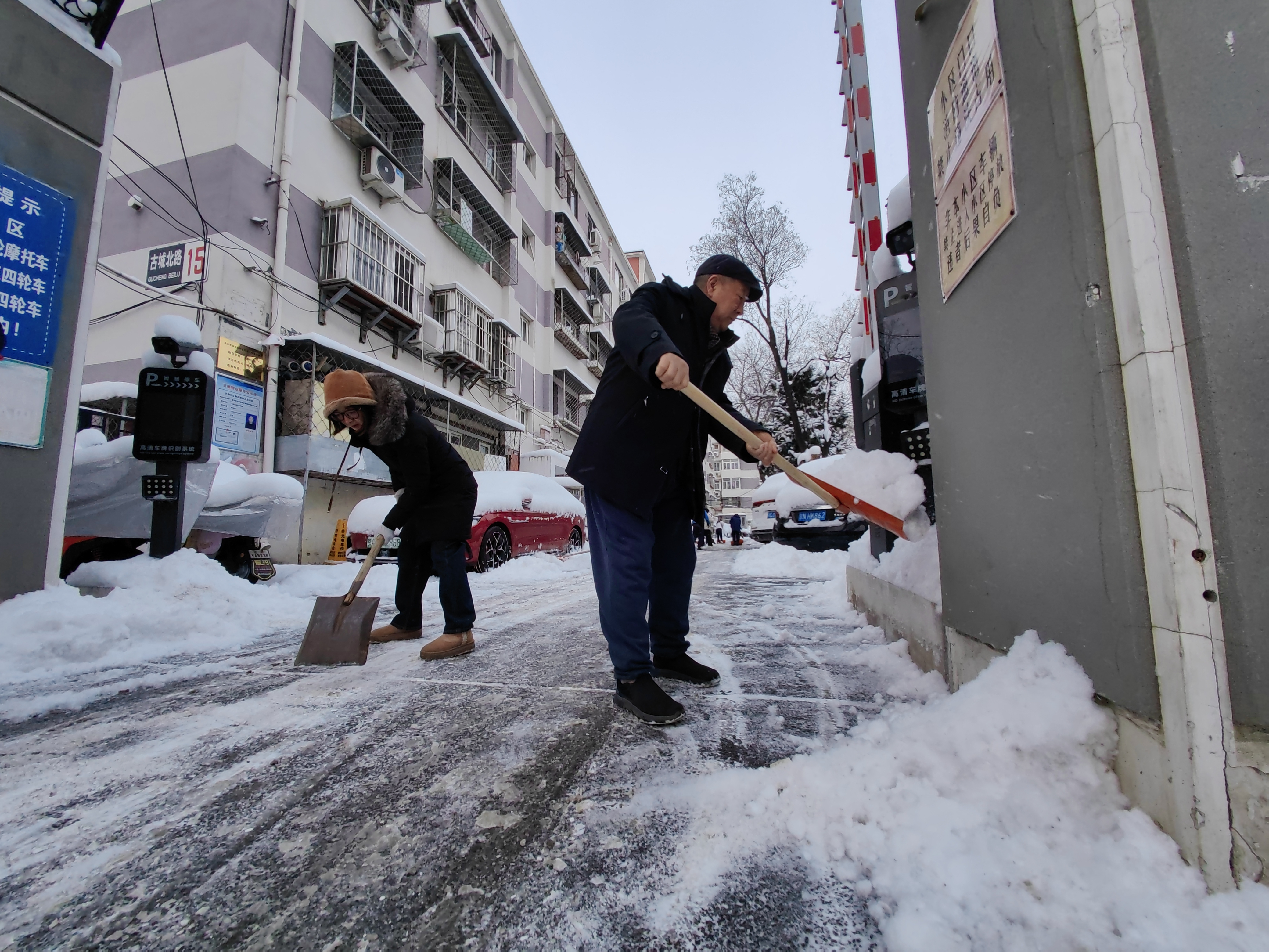 清晨气温很低,但参与者的热情不减,大家手持铁锹、扫帚等工具,重点对小区主要出入口、单元门前后、人行步道及活动场地等区域的积雪进行集中清理。 社工与党员们冲锋在前,老街坊们也干劲十足,现场忙碌而有序。经过一个多小时的共同努力,社区内各条主干道路和公共区域的积雪被基本清除,恢复了畅通与安全。