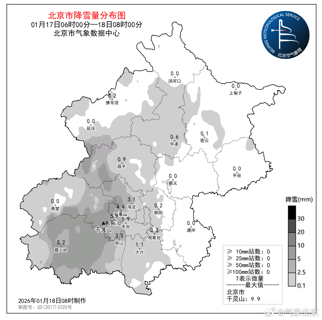市气象台首席预报员雷蕾介绍,这次降雪是华北地区典型的东风回流降雪,截至今早8时,全市平均降雪量1.2毫米,城区平均1.6毫米,最大降雪量出现在丰台区千灵山9.9毫米;此次降雪量分布不均,房山、门头沟、石景山、海淀等沿山一带出现大雪。