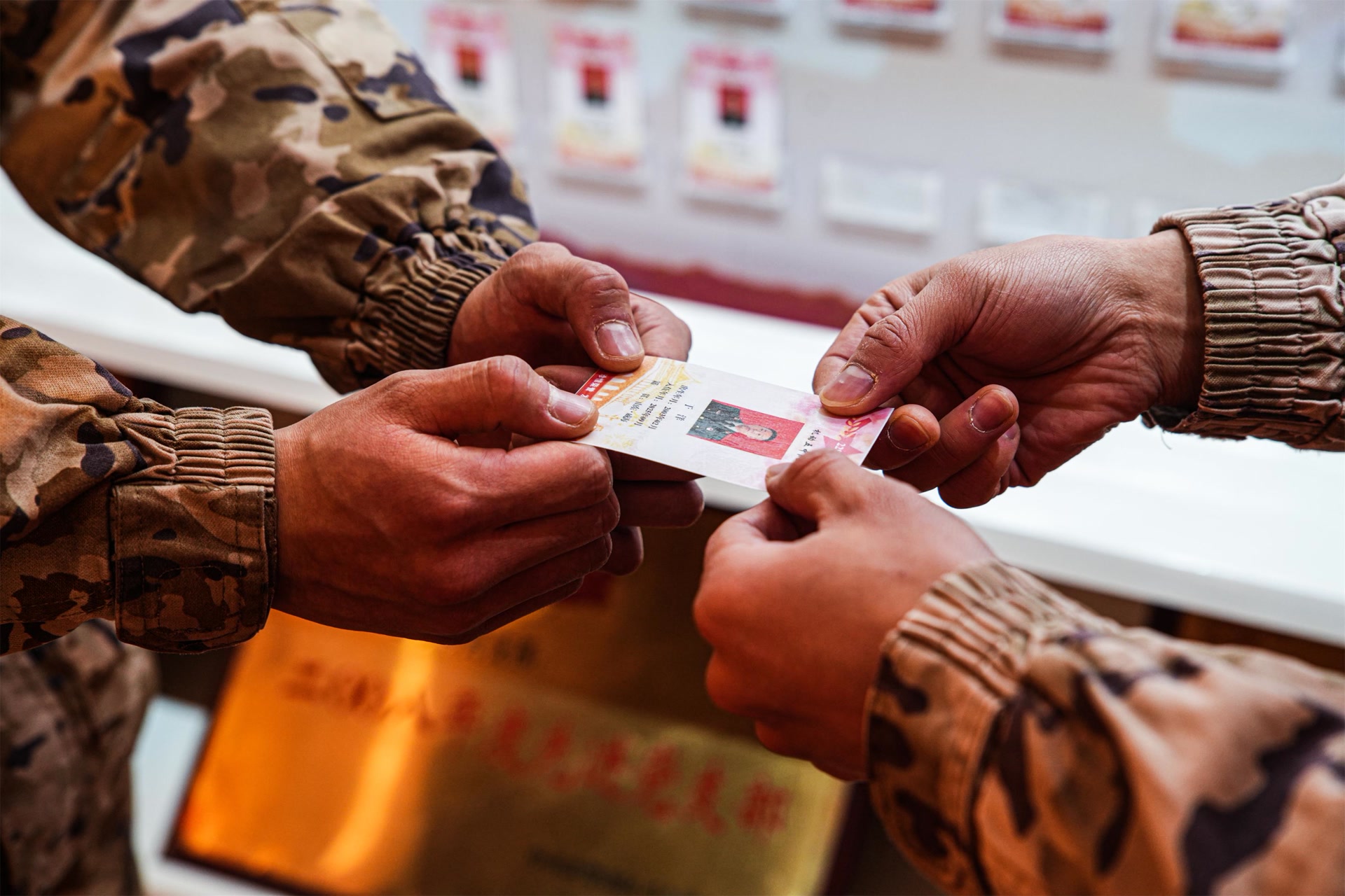 “这张身份牌,将是伴随你一生的荣耀”。入队仪式上,新兵曹珂诚郑重地从老兵手中接过身份编号卡,他的手臂微微颤抖,眼神灼热而坚定。新兵们庄严宣誓,铿锵誓词响彻军营,这一刻,自豪感、归属感在心中激荡。