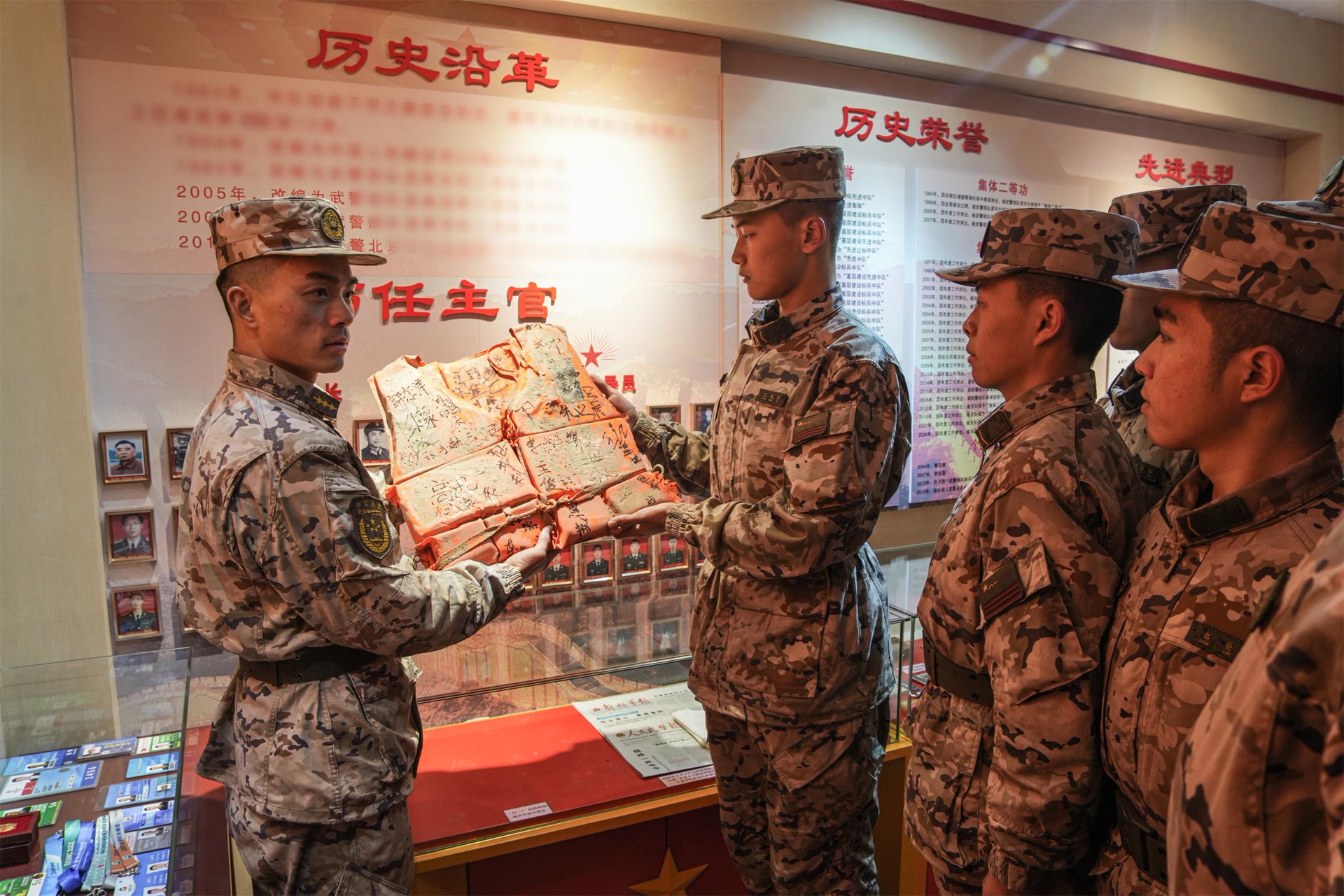 走进五中队荣誉室,政治指导员谈家升手里那件满是泥痕的橙色冲锋衣,立刻抓住了新兵们的目光。“这件冲锋衣记录着中队官兵在永定河堤日夜鏖战、不退一步的拼搏姿态……”一句句深情讲述,让新兵们仿佛置身于浊浪滔天的抗洪现场,脸上满是对老兵的崇敬。