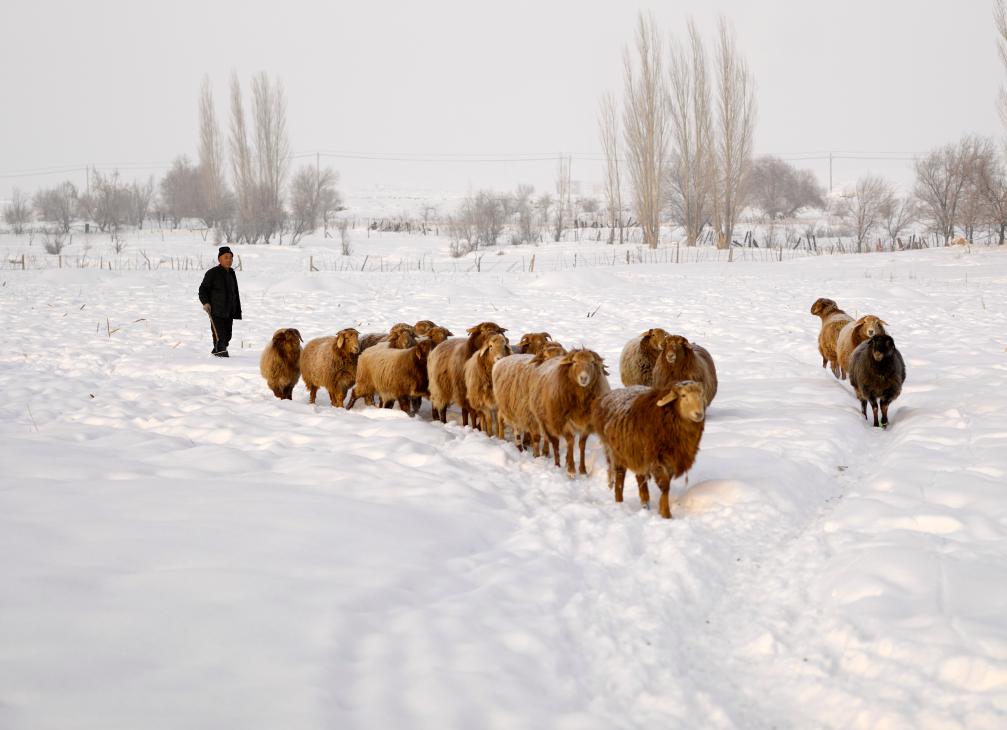 1月13日,牧民在新疆阿勒泰市阿苇滩镇雪都村牧羊。新华社发(叶尔江·木哈买提 摄)