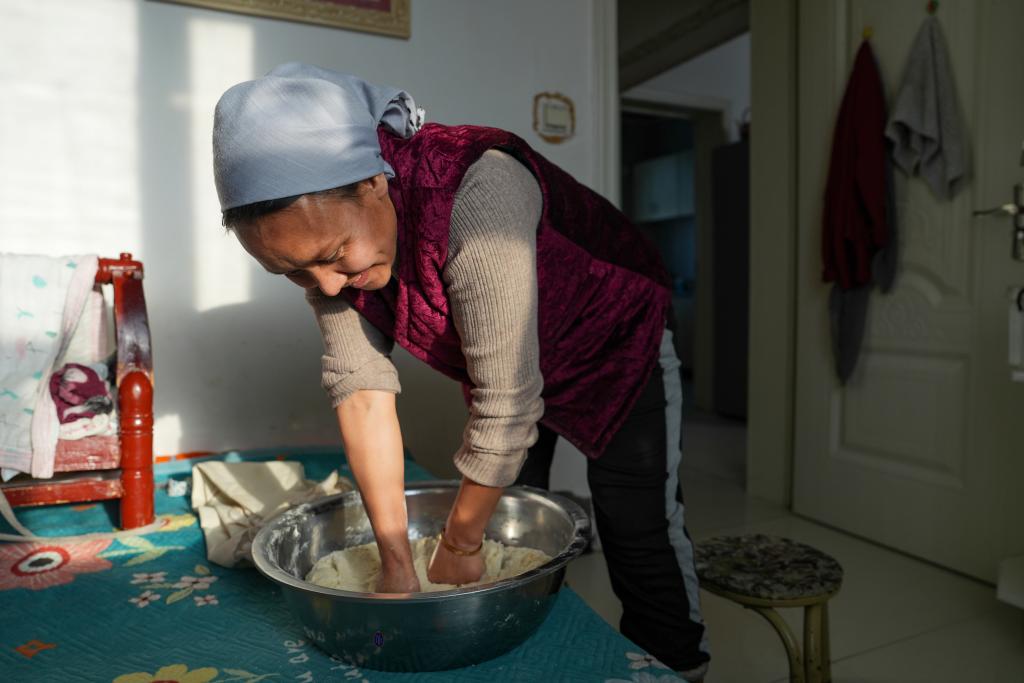 1月16日,在吐尔洪乡达尔肯村,一位村民在家中和面。新华社记者 胡虎虎 摄