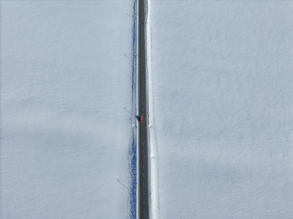 1月17日,车辆行驶在由富蕴县城通往可可托海镇的公路上(无人机照片)。新华社记者 胡虎虎 摄