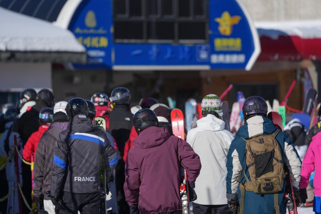 1月17日,雪友在可可托海国际滑雪度假区排队等候乘坐缆车。新华社记者 胡虎虎 摄