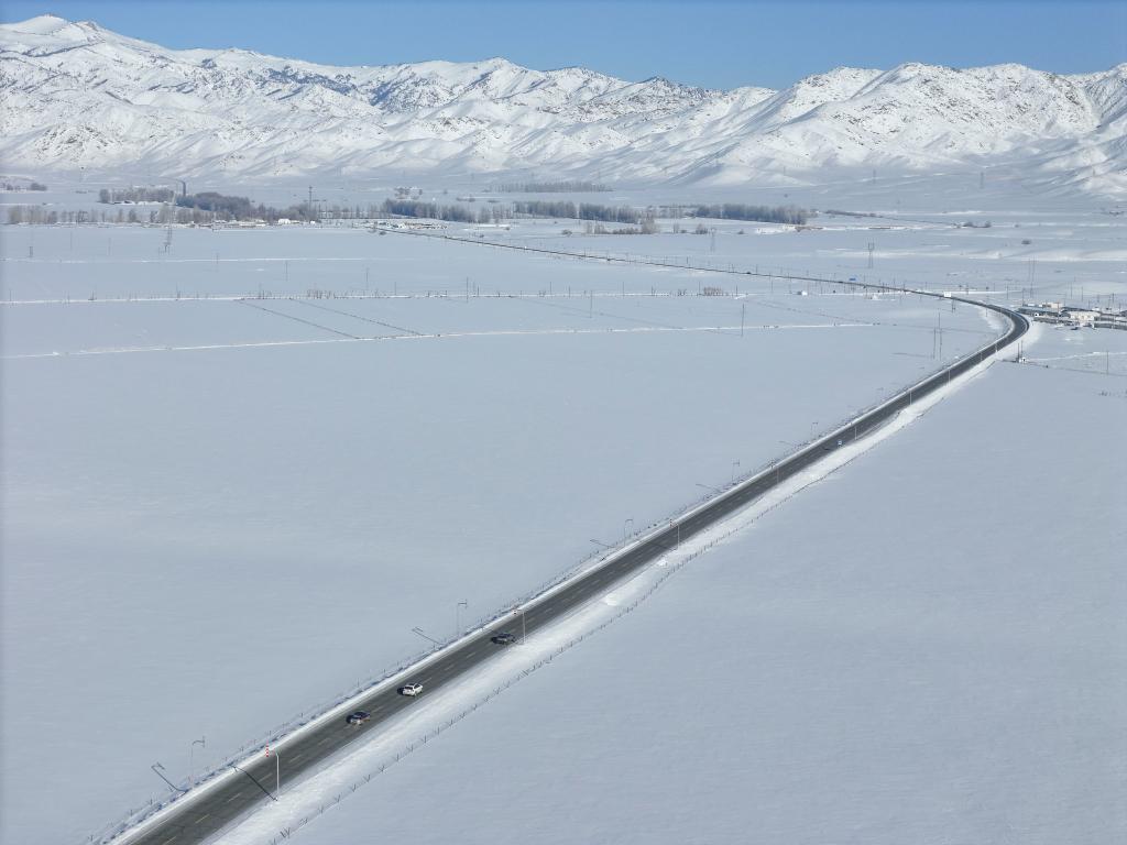 1月16日,吐尔洪乡供电所员工在巡检路上(无人机照片)。新华社发(努尔别克·努尔曼 摄)