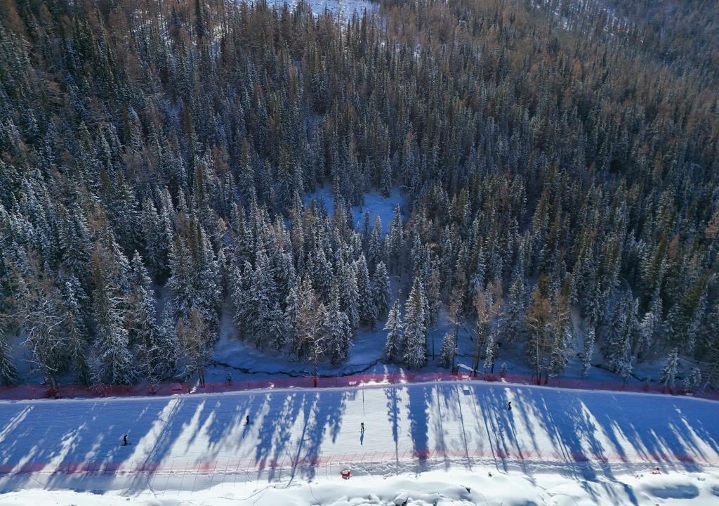 1月17日,雪友在可可托海国际滑雪度假区滑雪(无人机照片)。新华社记者 胡虎虎 摄