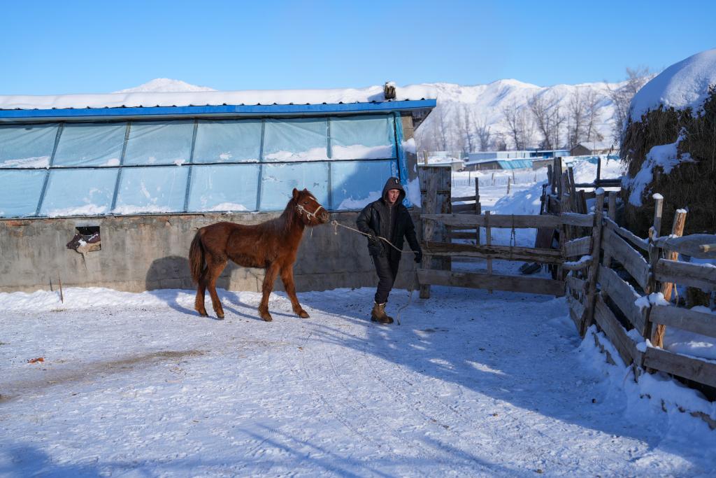 1月16日,吐尔洪乡的村民牵着马走在家中棚圈外。新华社记者 胡虎虎 摄