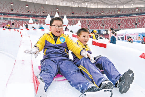 国家体育场,小朋友们体验冰滑道带来的刺激与惊险。徐志华 摄