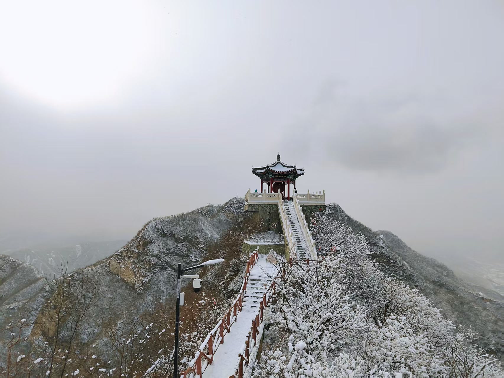 银装素裹,山间林木、石阶、古建皆覆厚雪,群峰在白雪映衬下更显俊秀,冬日美景别具韵味。