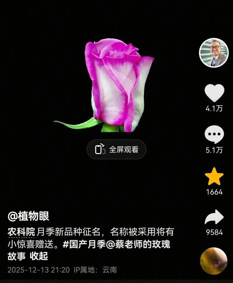 2025年12月,在云南省农业科学院发起的为新品种月季征名的活动中,一位网友写下留言,“刘宝华月季,因为我二舅叫刘宝华”,引发网友热议,得票率遥遥领先。