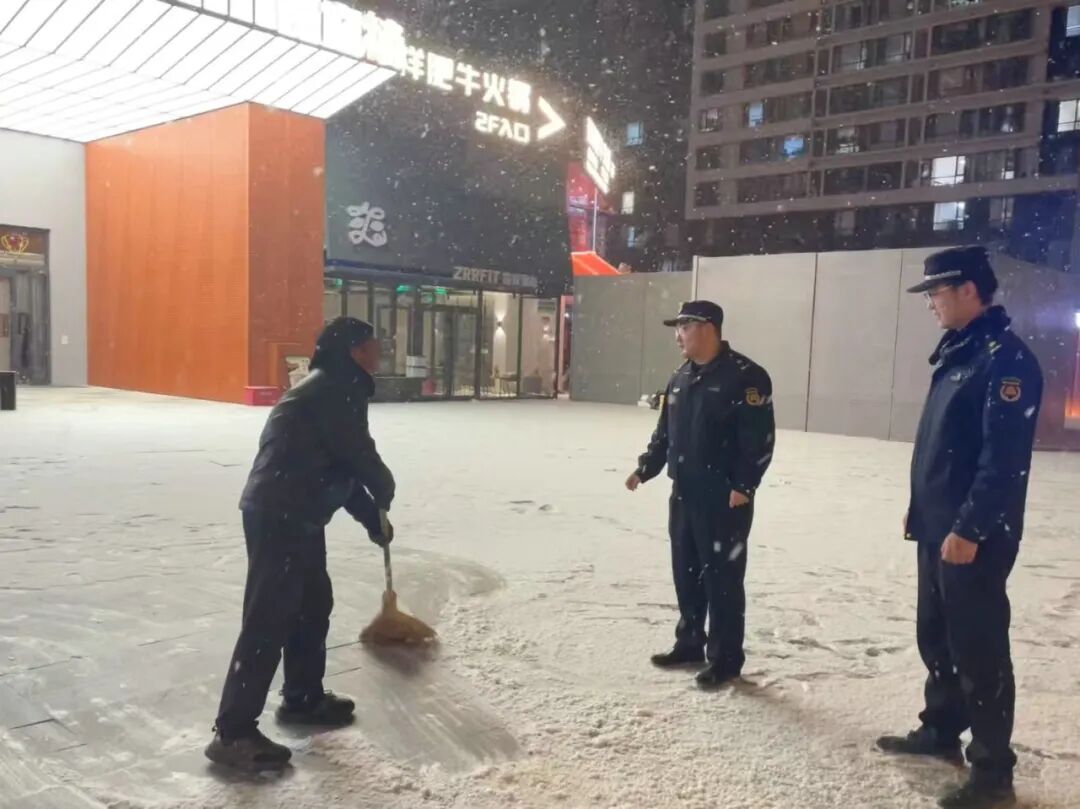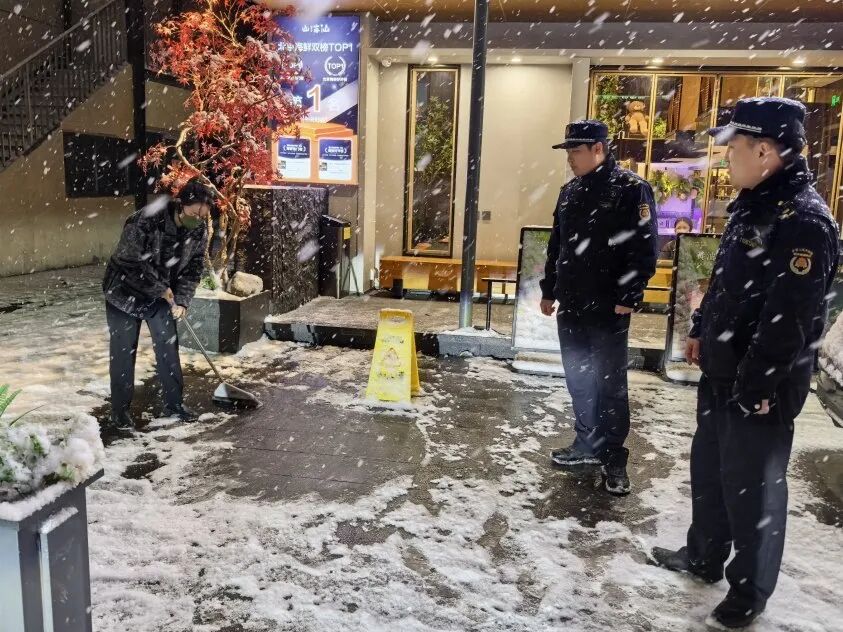 执法人员持续加强对大型商圈、交通枢纽、居民小区等重点人流区域的动态巡查,采取“分片包干、逐点排查”工作模式,指导相关单位规范铺设防滑设施、用好除雪工具。“咱们针对易结冰的点位,一定要规范堆放积雪,保证群众通行安全。”城管执法人员现场特别提醒“门前三包”责任单位负责人。