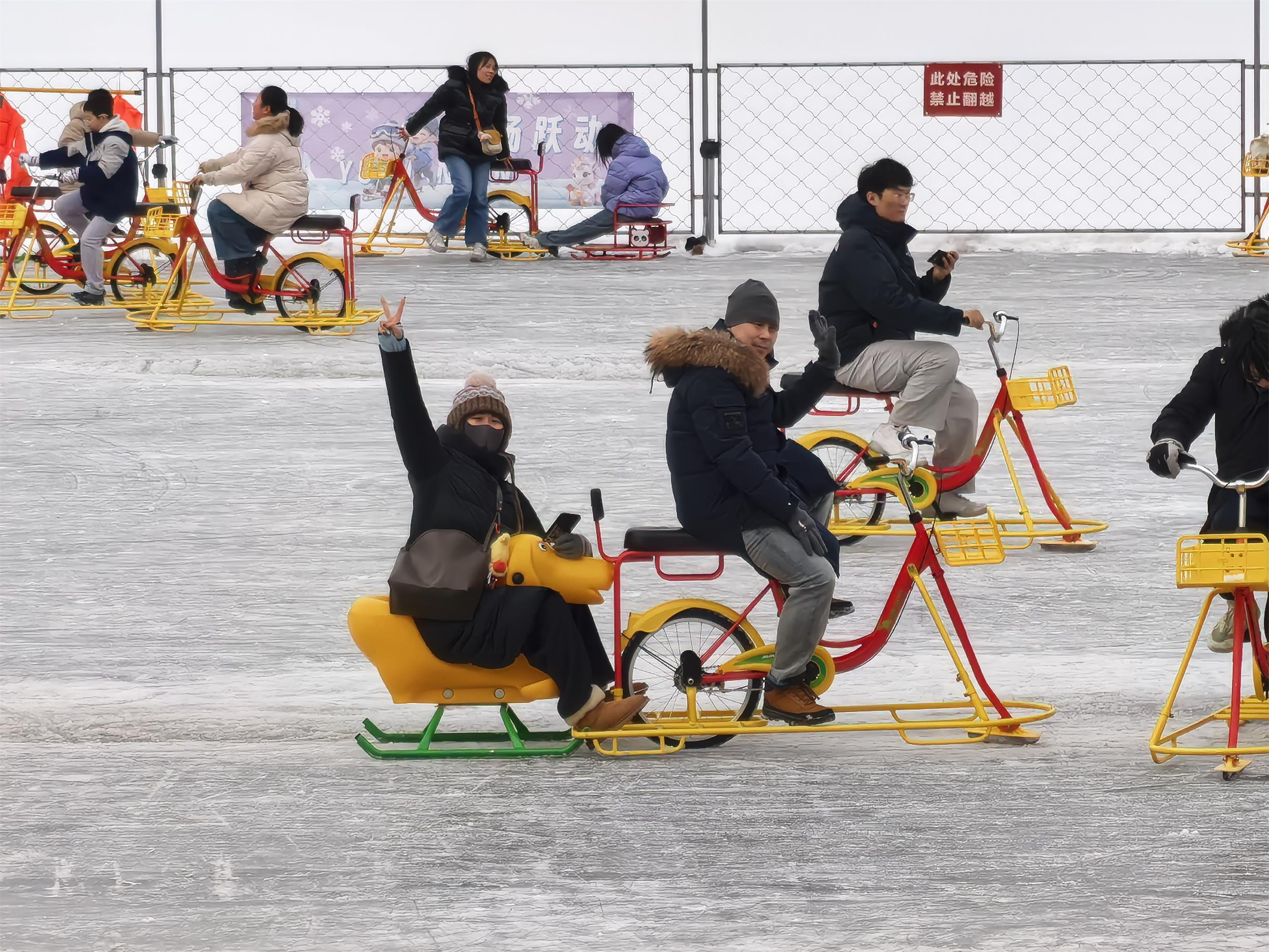 公园的冰场、雪场也格外热闹。在玉渊潭公园冰场,人们踩着冰车、蹬着冰上自行车,在冰面上穿梭嬉戏,笑声随着风飘出老远。