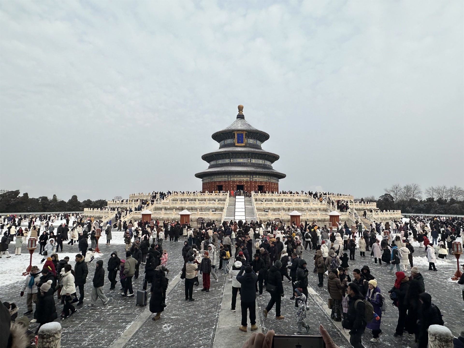 1月18日,不少市民游客登上景山公园制高点万春亭,俯瞰银装素裹的紫禁城,眺望北京中轴线初雪,感受历史的厚重与现代的交融。