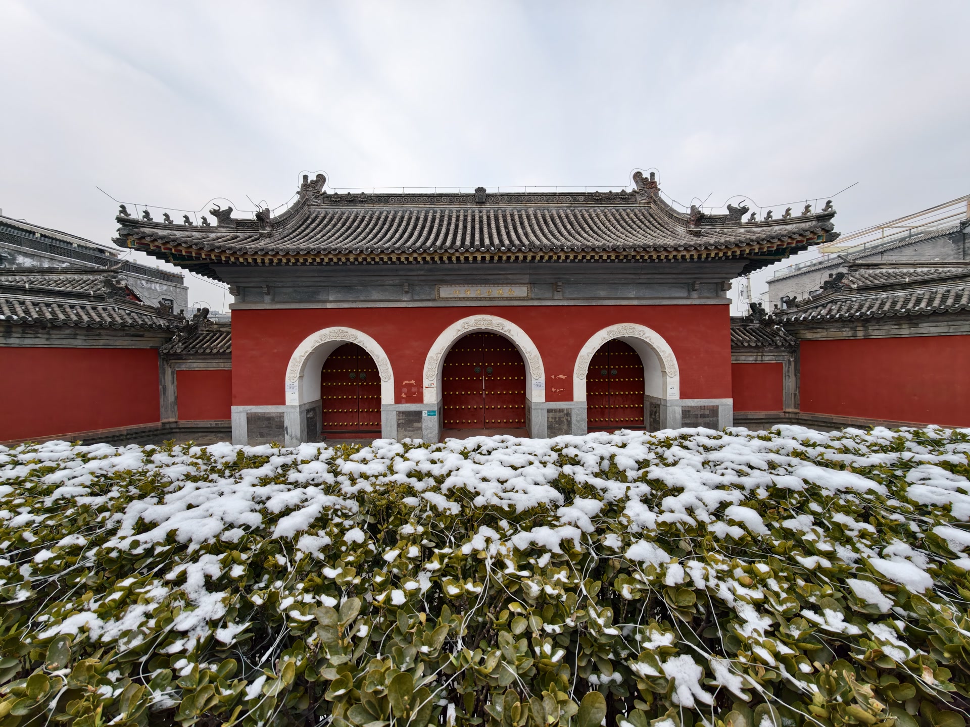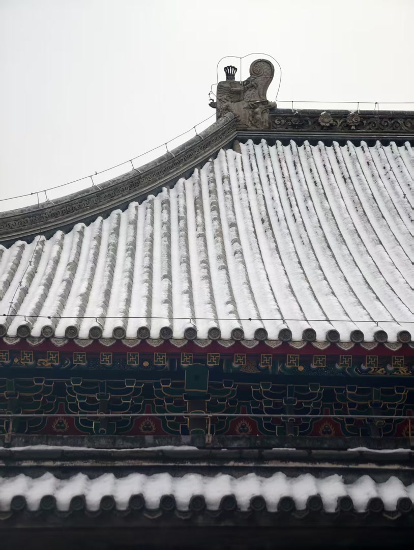 白雪覆盖下,白塔寺少了平日的喧嚣,显得格外安静,洁白的雪为白塔寺披上一层素装,红墙与白雪相互映衬,色彩搭配简洁而不失典雅。