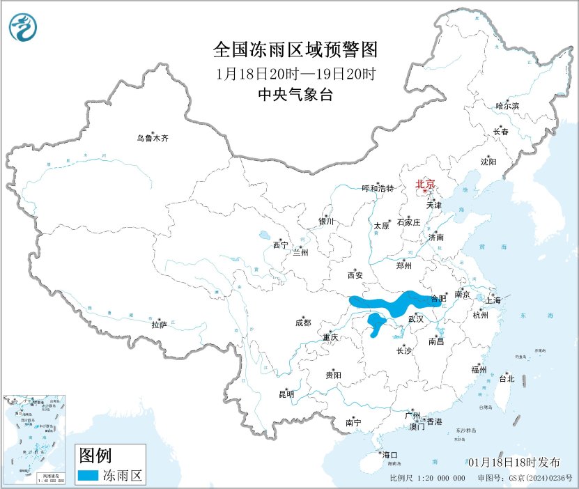 预计,1月18日20时至19日20时,河南东南部、安徽西部、湖北北部和西部、陕西东南部、重庆北部等地的部分地区有冻雨或冰粒,上述大部地区冻雨量1~3毫米,山区可达3~5毫米、局地8毫米以上。