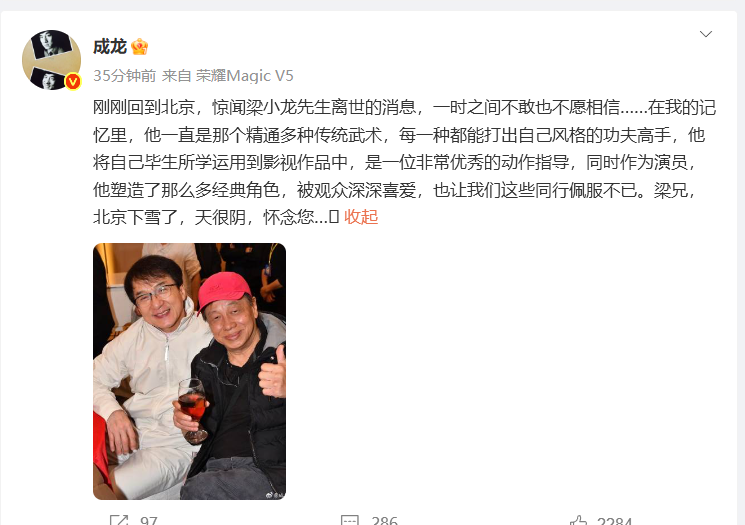 @成龙 在社交平台发文悼念梁小龙:刚刚回到北京,惊闻梁小龙先生离世的消息,一时之间不敢也不愿相信……在我的记忆里,他一直是那个精通多种传统武术,每一种都能打出自己风格的功夫高手,他将自己毕生所学运用到影视作品中,是一位非常优秀的动作指导,同时作为演员,他塑造了那么多经典角色,被观众深深喜爱,也让我们这些同行佩服不已。梁兄,北京下雪了,天很阴,怀念您……