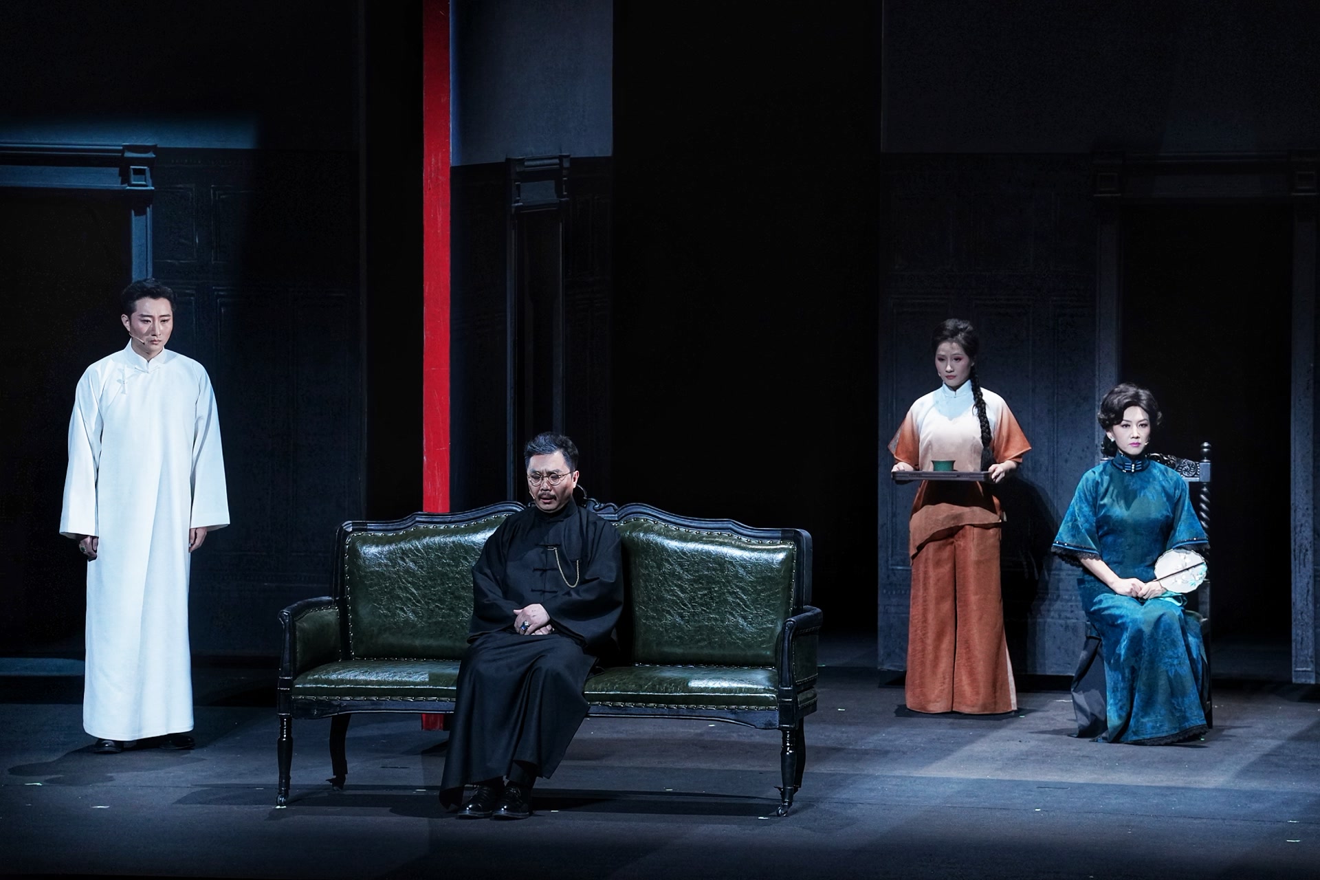 于是,承担了不少说明功能的鲁贵和相关剧情被进一步精简,北京曲剧《雷雨》呈现出比各类话剧版本更加明快集中的推进节奏。“我们希望,这一版《雷雨》能带给观众一种‘熟悉的陌生感’,故事仍是那个故事,悲剧仍是那个悲剧,但经由戏曲写意美学的转化,可以唤起观众深层的情绪共鸣与审美思考。”北京曲剧《雷雨》饱含创作者对经典的当代新解,重构故事如是,舞台表达亦如是,黑白为主的色调中,一抹猩红时隐时现,令人心惊——欲望、冷峻、鲜血,这些关键词构筑起一种凸显“现代感”的风格追求。