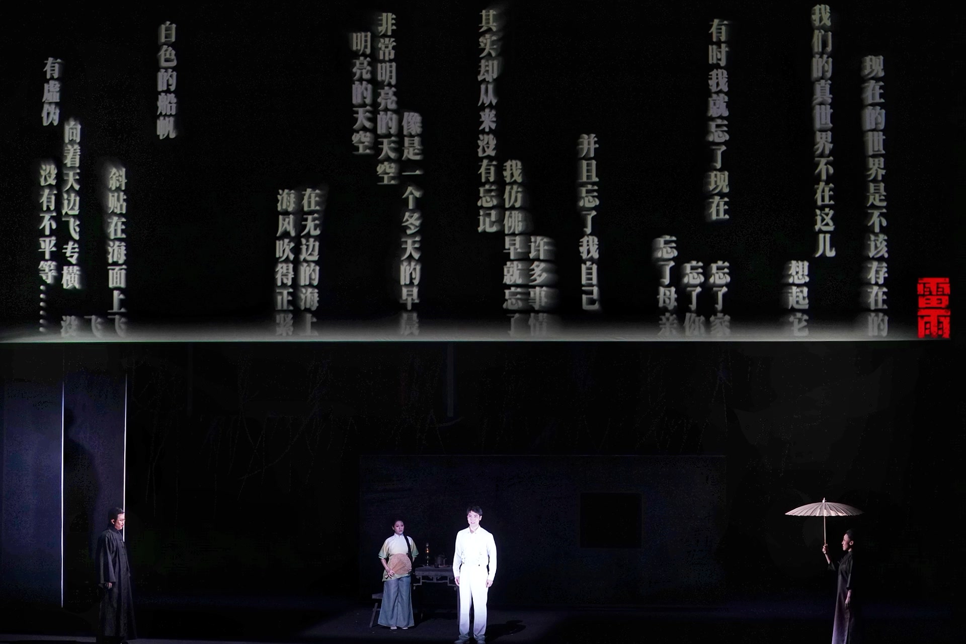 大幕拉开,惨淡的白灯笼上书“周公馆”三字,一抹幽魂飘来,倾诉着,把观众带回中国戏剧史上最广为人知的那个雷雨之夜:简洁的几何立体框架勾勒门扉窗扇,层叠往复,黑白色调将这座牢笼般的公馆浸染得冰冷沉重。周冲的灵魂游离俯瞰,缓缓道来这里发生的沉痛悲剧。