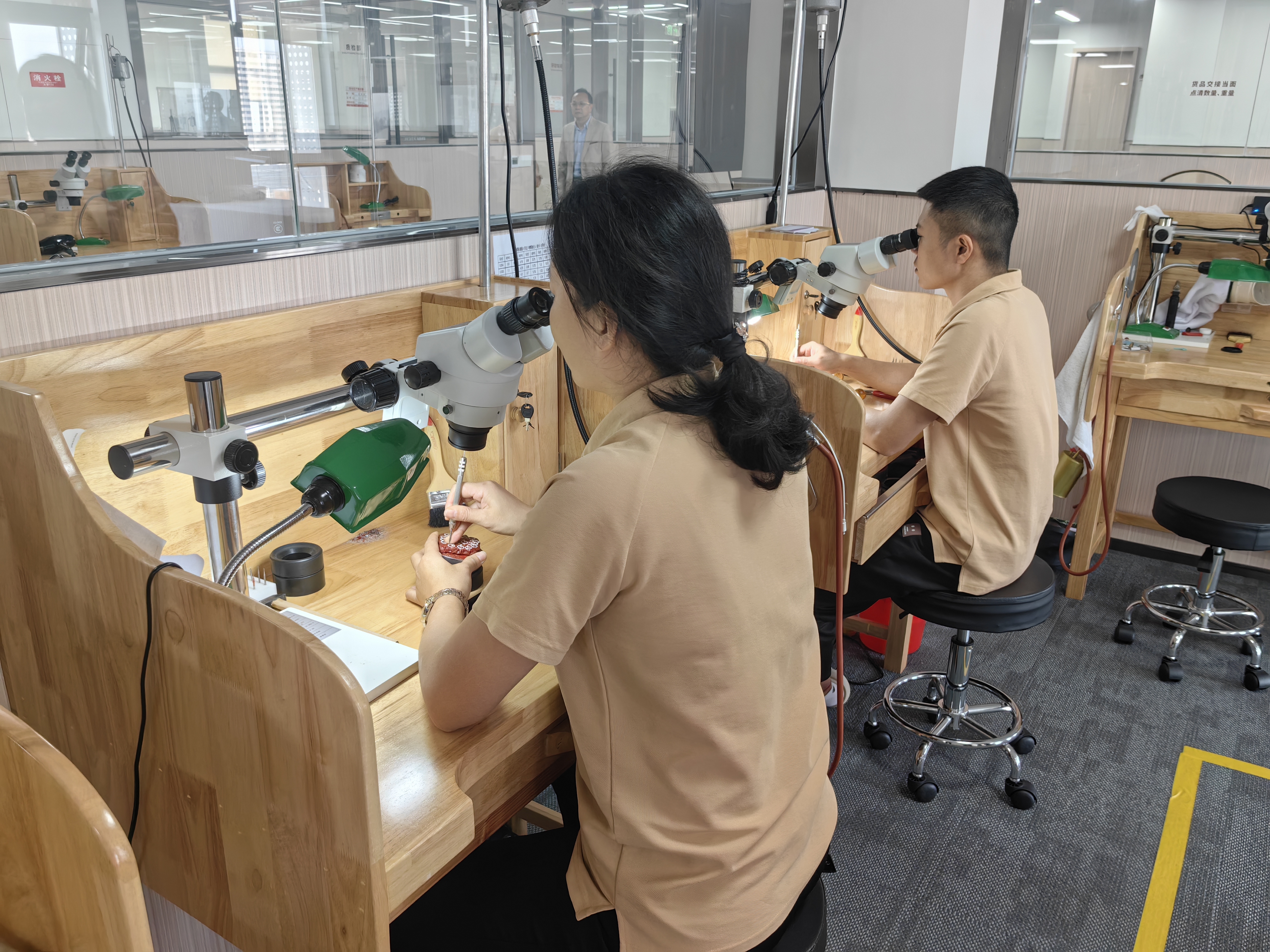 在位于三亚的海南海润珍珠股份有限公司,车间内柔和的专业灯光下,工匠们凝神屏息,借助显微镜,用精细镊子将珠宝稳稳嵌入雕花珠托。
