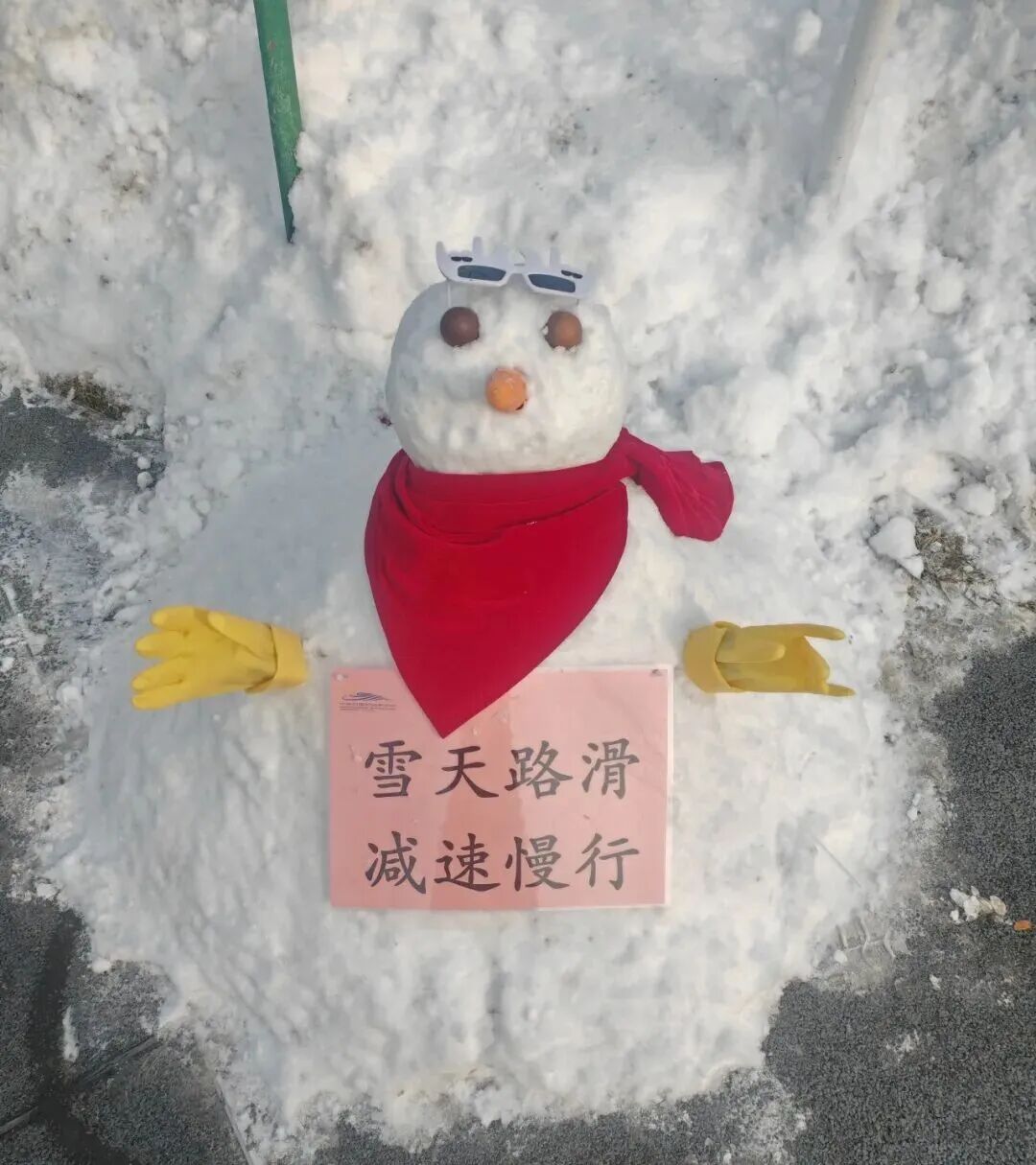 有的举着 “雪天路滑,减速慢行” 的提示牌