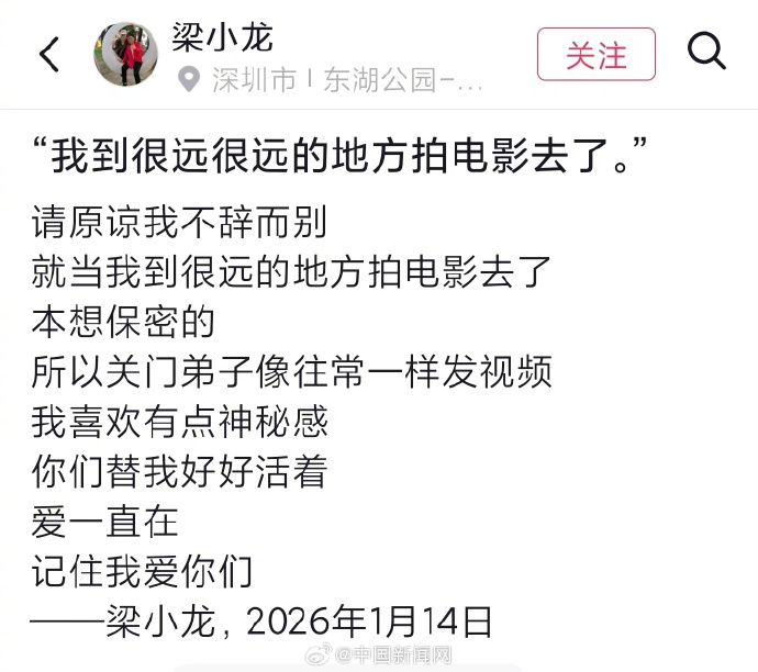 梁小龙的账号发文:“我到很远很远的地方拍电影去了。”