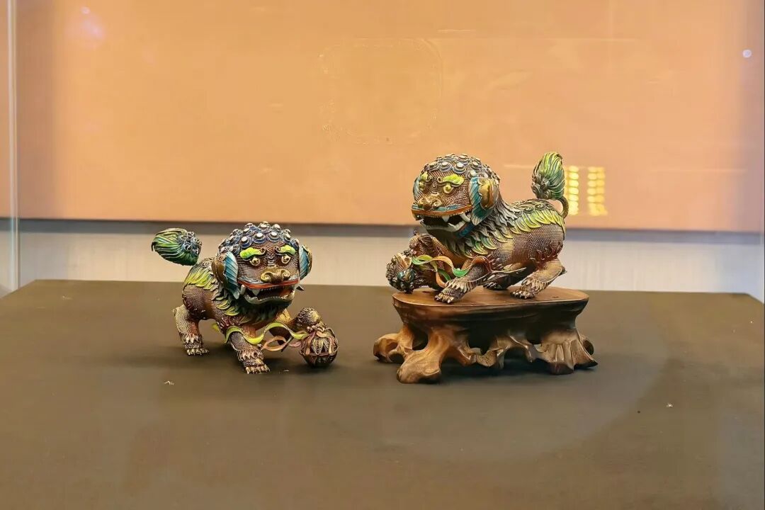 馆长张文潮着重介绍了馆中的雌雄瑞狮摆件。“它是特定时期工艺的典型代表,将技艺与美学完美融合。”这件作品的制作者是花丝镶嵌一级技师杜建毅,融合了传统花丝工艺与珐琅工艺。狮子的身躯皆由细密银丝编织后塑形而成,狮身花纹、蓬松毛发则以珐琅工艺点睛,既还原了毛发的层次,又让瑞狮更显灵动。