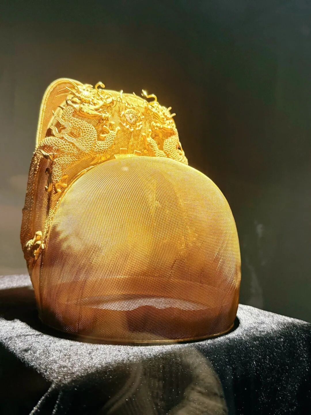 仿明《金丝翼善冠》,仅前屋部分便由518根直径0.2毫米的细金丝编结而成,整冠更是耗用852根金丝,看上去薄如轻纱,复刻了明代皇家的至尊气度。