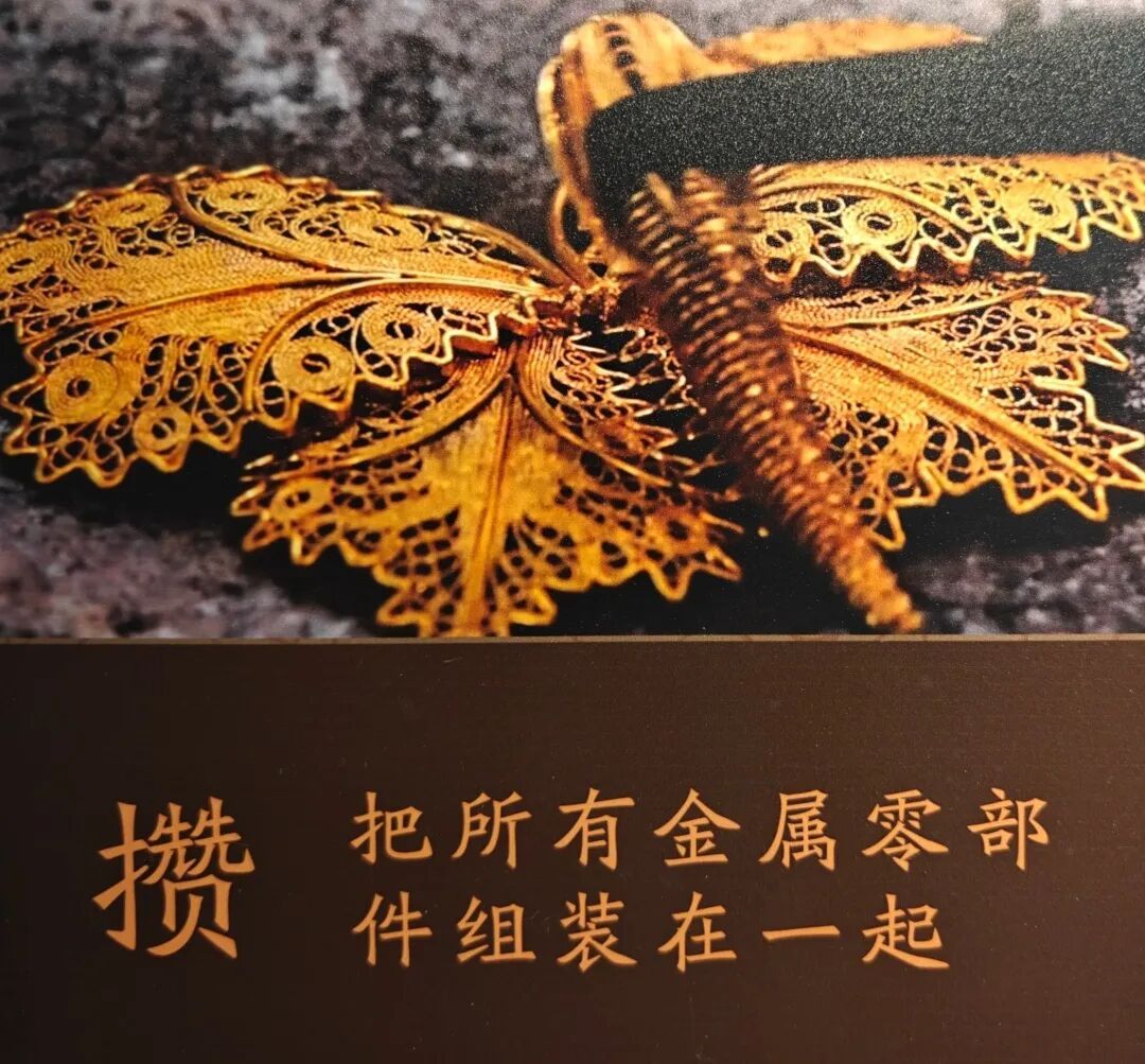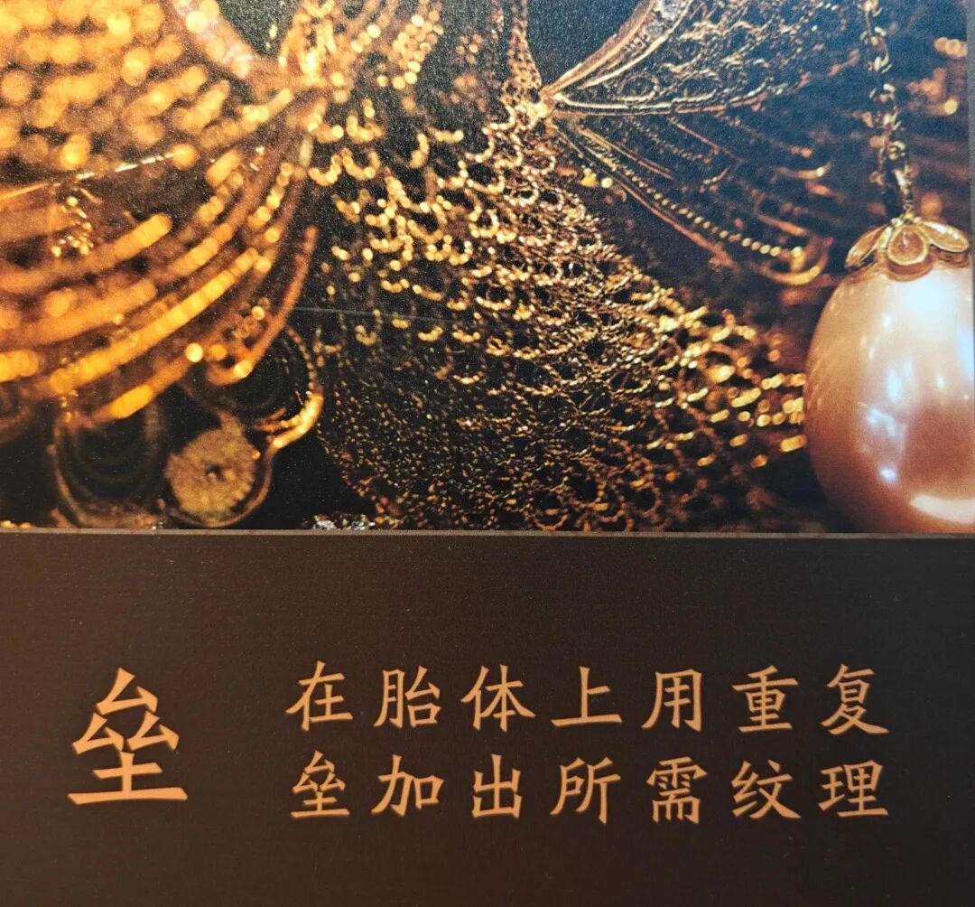 杜建毅介绍,这门工艺是“花丝”与“镶嵌”的结合。“花丝”是将金银等金属拉成丝,再经掐、填、攒、焊、堆、垒、织、编八大工序塑造成型;“镶嵌”则是将宝石、珍珠等嵌入金属基座。