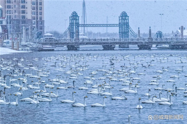 而当真正的雪花飘落,驻停水面的大天鹅,又像一团团雪球,融入风雪弥漫的天鹅湖。这里更似远离喧嚣的“天上人间”,白雪与鹅羽相映,纯洁得令人将要落泪。